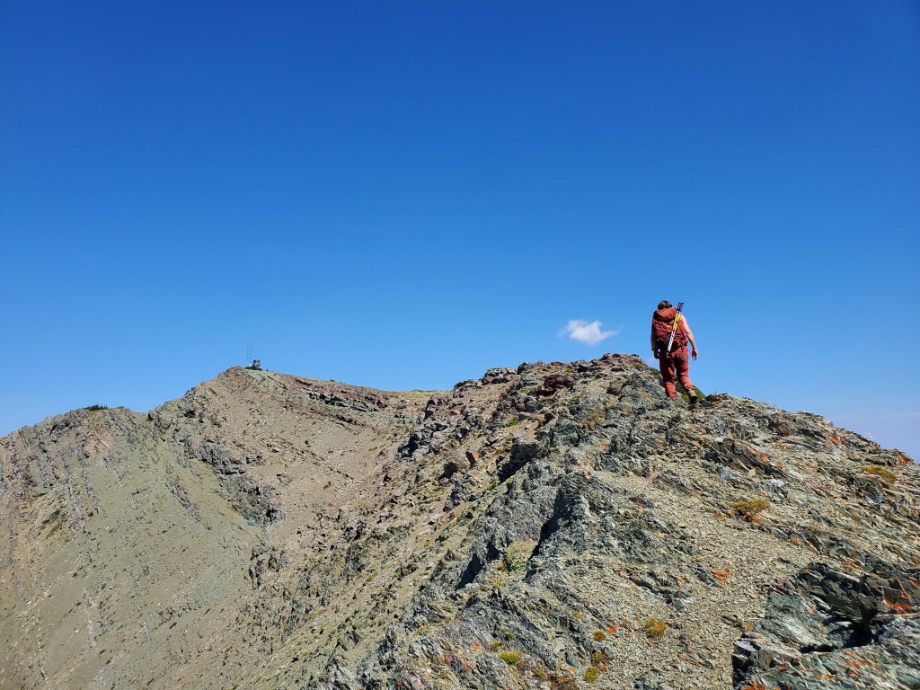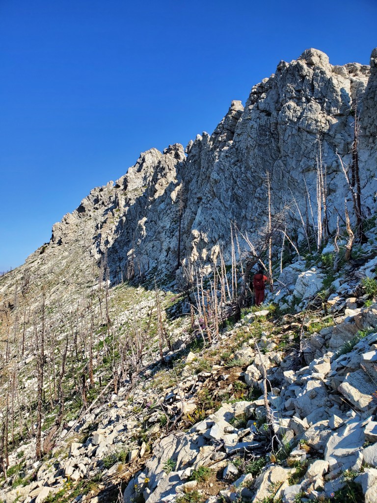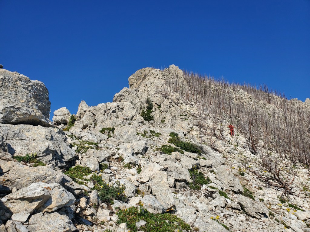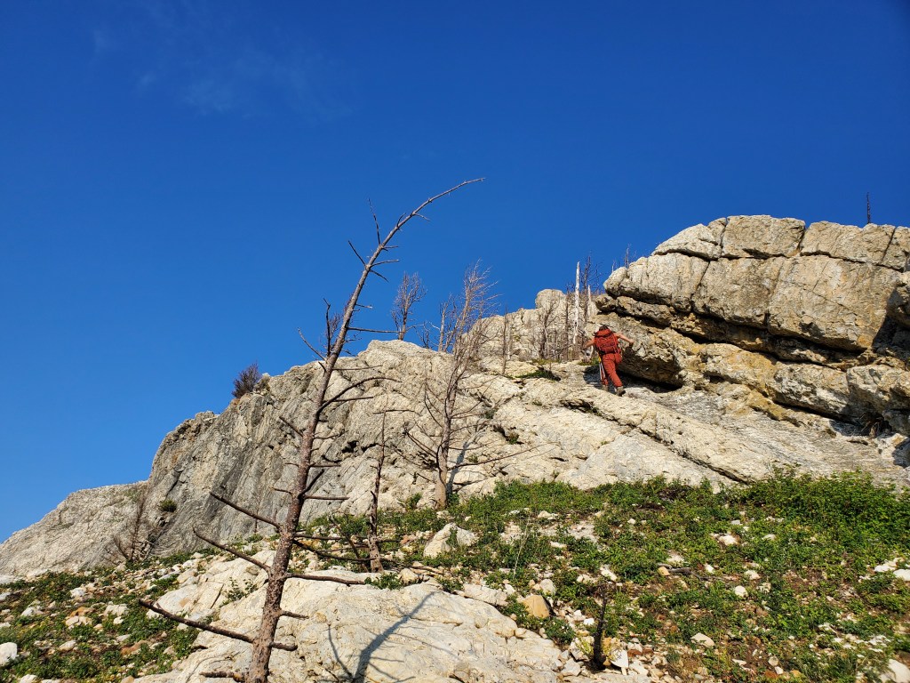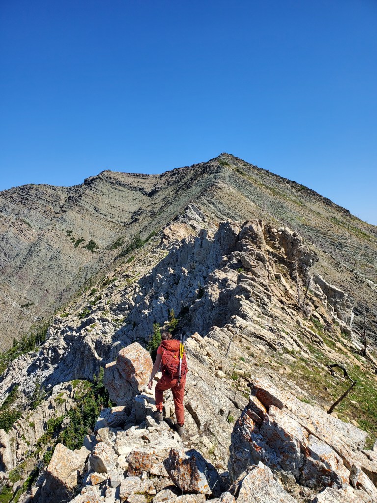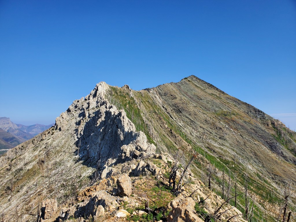 Mount Crandell has two common ascent routes: Bear’s Hump and Tick Ridge. We’d already had a few sweltering hot days in Waterton and, with temperatures forecast to reach 30C+ again, we felt content to stick to the more moderate Tick Ridge route for this day. The trip reports I’d found were for either the more difficult Bear’s Hump route or for the Southeast Slopes (descent route), so I didn’t look too closely at them – if I had, I would have realized that the hardest part of the Bear’s Hump route is the cockscomb, which is shared with the Tick Ridge route. Even with bypassing the cockscomb, there were a couple of difficult moves needed to regain the ridge.