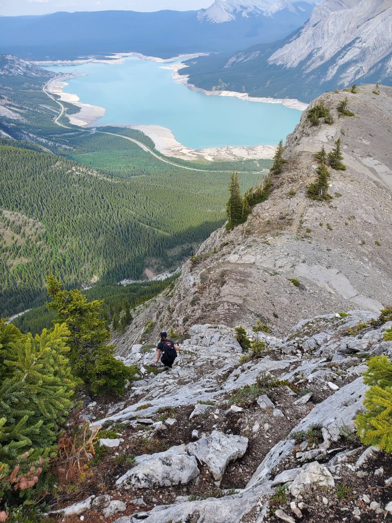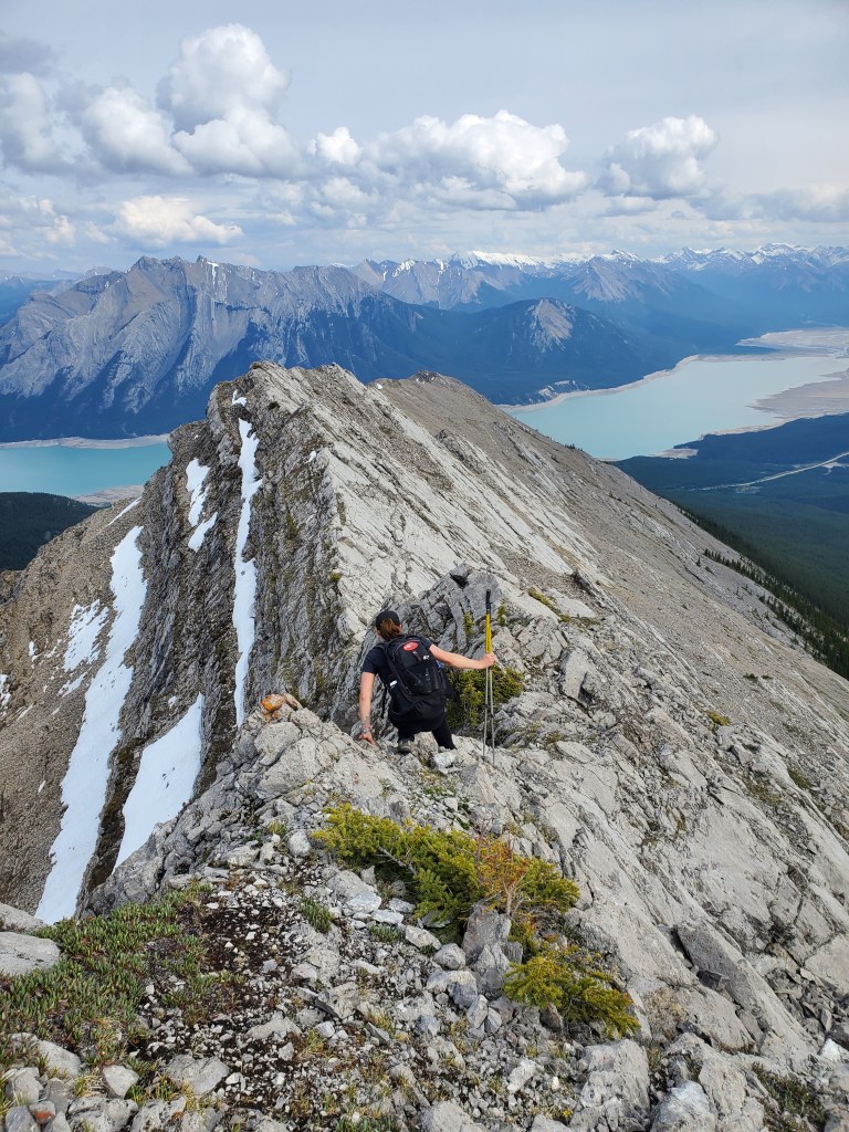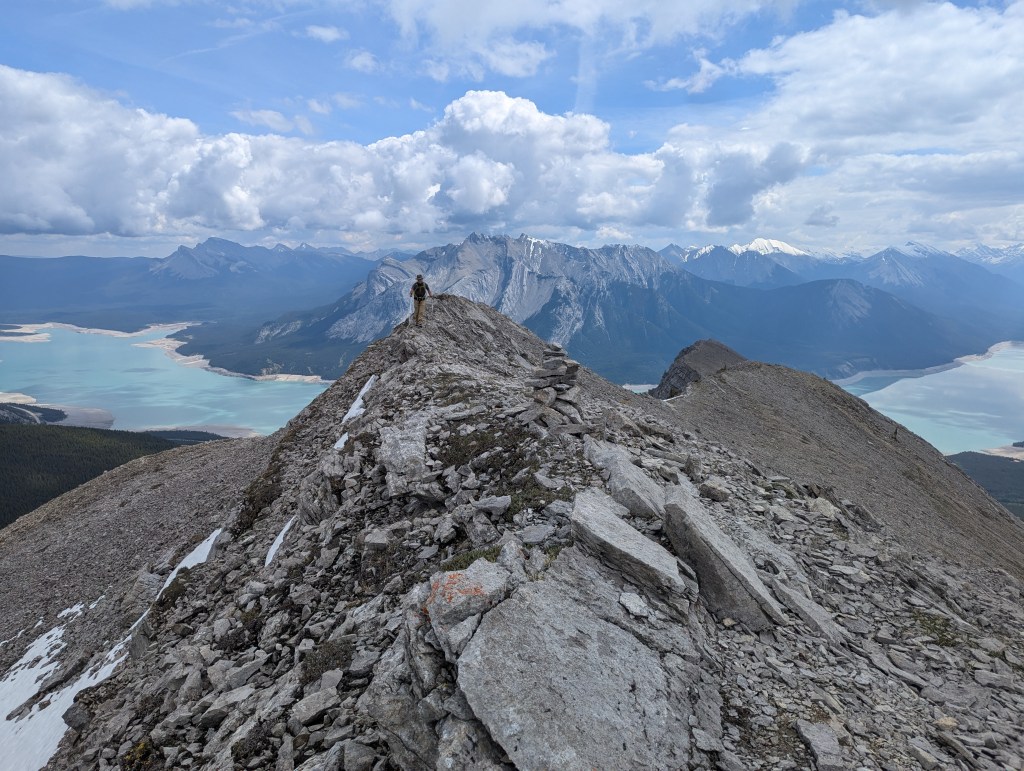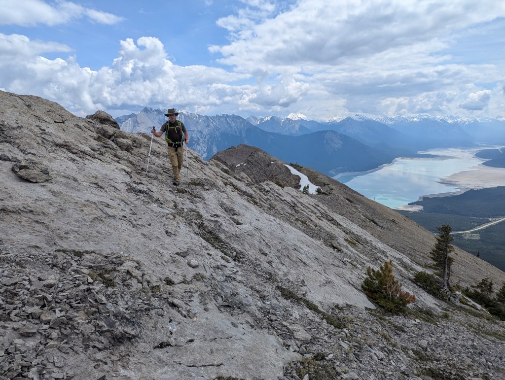 A Y in the trail is reached about 200 m in. The line to the left is ever so slightly shorter, but the line to the right has far better views. We kept to the right.Views open up across Abraham Lake in about 10 min and continue throughout the day.The vision quest site for which the ridge is named is reached in just over half an hour.Looking ahead from the vision quest site to the hikers’ summit. The equally popular scramblers’ summit is only about 200 m further along the ridge, but requires a bit of moderate scrambling. Compared to the overall scale of the ridge and the progressively higher points reached beyond these, the distinction between these two summits is immaterial in my mind.The next 50 min is an unglamourous trudge up scree trails, but does end eventually. This shot is nearing the hikers’ summit. The cliff further back is the scramblers’ summit.Probably the best views of the day are at the hikers’ summit!Another group can be seen descending the scramblers’ summit. They will follow the ridge to the small shrub furthest left, and then head straight down. This is the same as the ascent route and it looks worse than it is. Once up close, the moves are all there and the exposure is never beyond moderate.Just beyond the previous picture, the “crux” for the route to scramblers’ summit is a short cliff band. A few viable options exist and the easiest line is marked with cairns.We reached the scramblers’ summit in just shy of 1 1/2 hrs, from the parking lot, and then continued along the ridge. At the next cliff band encountered (pictured) we bypassed by walking around the right side.Looking back along the ridge. The scramblers’ summit is the high-ish point at the far end of the ridge. We still have plenty of ridge ahead of us!A couple of additional summit registers and/or tall cairns are passed along the ridge, with no seeming logic to their placement.Continuing our ridge walk through some fun slabby sections. Only one move of difficult scrambling was encountered during our day. I tackled it head-on and Dan easily bypassed to climber’s left. The bypass is necessary to keep this route at a moderate grade.Looking ahead. No noteworthy high points are even within view yet. It’s a long ridge!Continuing ahead to more slab – yay! Note the interesting cave/window features at the left side of this photo.A closer look a the caves/windows.Dan for scale.We kept an eye out here for the line illustrated by Pawlyk for reaching what he describes as “the second highest point on the ridge”, the high point ahead. We had to detour right, walking down two cliff layers, but easily hiked through once on the correct line. It’s tempting to descend only one cliff layer, but this gets cliffed out quickly.