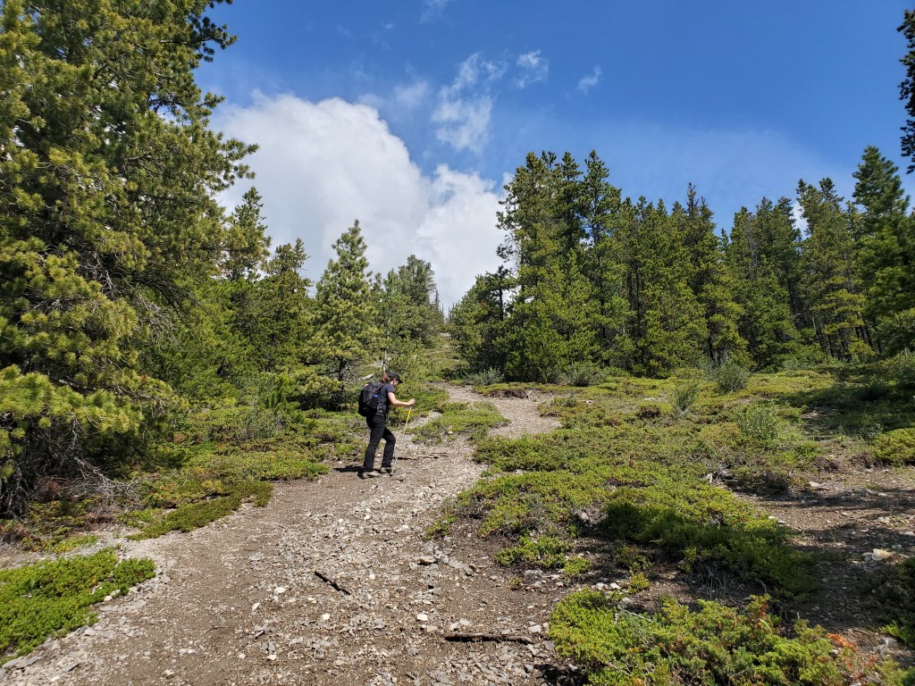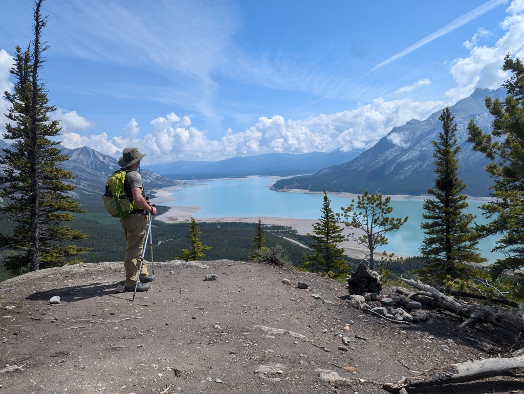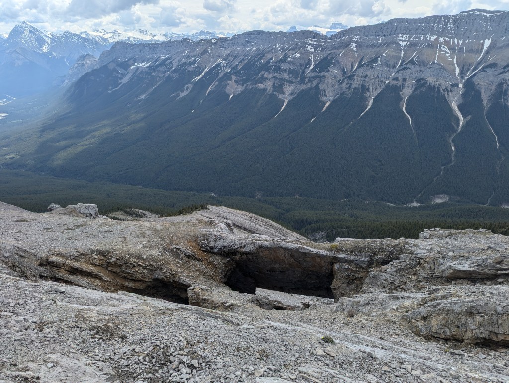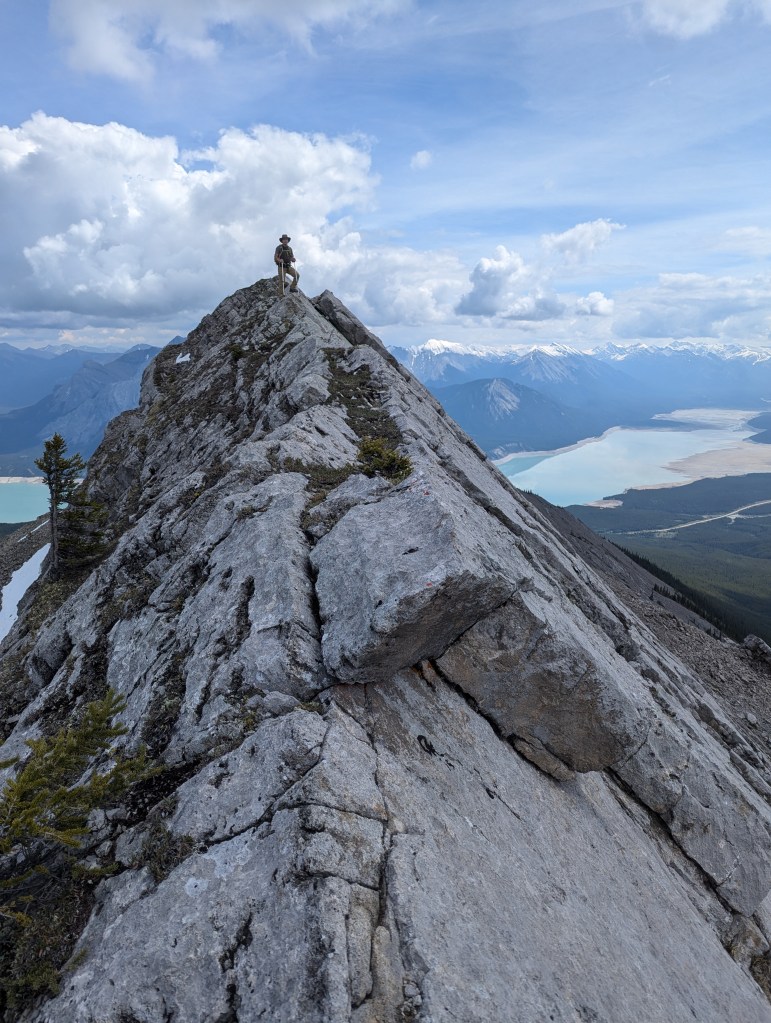 A Y in the trail is reached about 200 m in. The line to the left is ever so slightly shorter, but the line to the right has far better views. We kept to the right.Views open up across Abraham Lake in about 10 min and continue throughout the day.The vision quest site for which the ridge is named is reached in just over half an hour.Looking ahead from the vision quest site to the hikers’ summit. The equally popular scramblers’ summit is only about 200 m further along the ridge, but requires a bit of moderate scrambling. Compared to the overall scale of the ridge and the progressively higher points reached beyond these, the distinction between these two summits is immaterial in my mind.The next 50 min is an unglamourous trudge up scree trails, but does end eventually. This shot is nearing the hikers’ summit. The cliff further back is the scramblers’ summit.Probably the best views of the day are at the hikers’ summit!Another group can be seen descending the scramblers’ summit. They will follow the ridge to the small shrub furthest left, and then head straight down. This is the same as the ascent route and it looks worse than it is. Once up close, the moves are all there and the exposure is never beyond moderate.Just beyond the previous picture, the “crux” for the route to scramblers’ summit is a short cliff band. A few viable options exist and the easiest line is marked with cairns.We reached the scramblers’ summit in just shy of 1 1/2 hrs, from the parking lot, and then continued along the ridge. At the next cliff band encountered (pictured) we bypassed by walking around the right side.Looking back along the ridge. The scramblers’ summit is the high-ish point at the far end of the ridge. We still have plenty of ridge ahead of us!A couple of additional summit registers and/or tall cairns are passed along the ridge, with no seeming logic to their placement.Continuing our ridge walk through some fun slabby sections. Only one move of difficult scrambling was encountered during our day. I tackled it head-on and Dan easily bypassed to climber’s left. The bypass is necessary to keep this route at a moderate grade.Looking ahead. No noteworthy high points are even within view yet. It’s a long ridge!Continuing ahead to more slab – yay! Note the interesting cave/window features at the left side of this photo.A closer look a the caves/windows.Dan for scale.We kept an eye out here for the line illustrated by Pawlyk for reaching what he describes as “the second highest point on the ridge”, the high point ahead. We had to detour right, walking down two cliff layers, but easily hiked through once on the correct line. It’s tempting to descend only one cliff layer, but this gets cliffed out quickly.