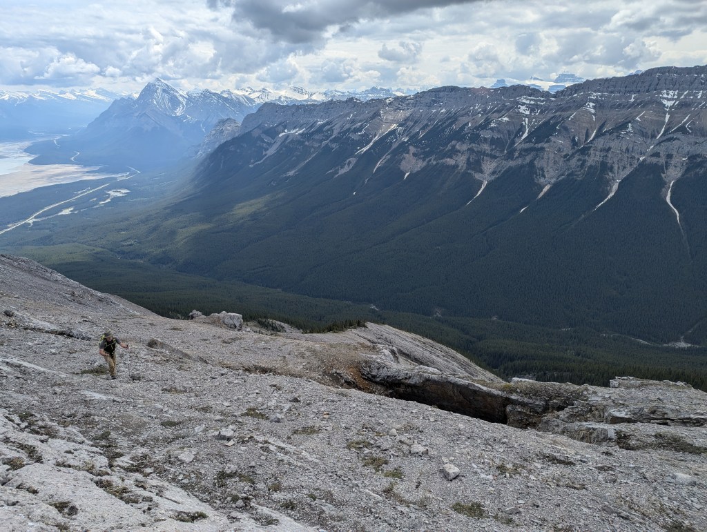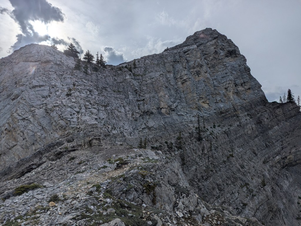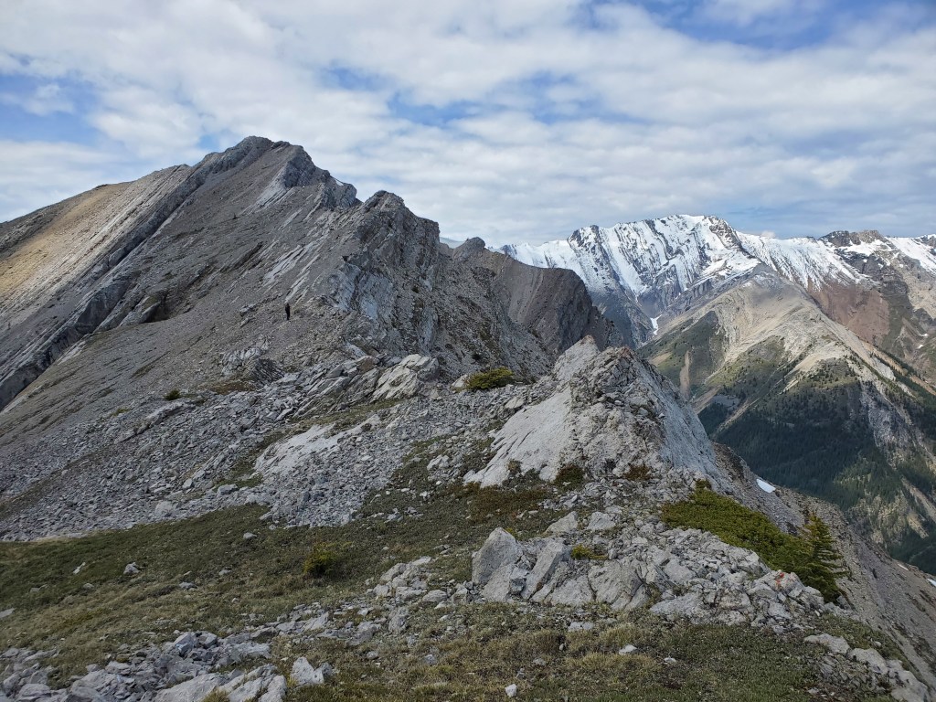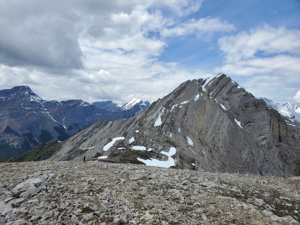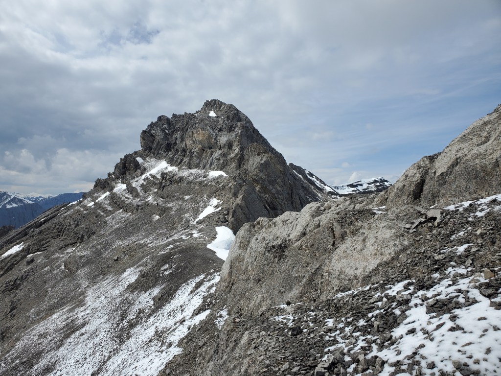 I believe this is the third highest point on the ridge and what Pawlyk describes as the “true summit just poking out” in his photo (or what I describe further on as the pinnacle) is the second highest peak. The true summit is still quite far back from here.The correct line for reaching the second/third highest point on the ridge is this way.Working our way up and over the second/third highest point, the pinnacle that will soon stop us comes into view.The cliffs to the right side of the pinnacle looked impassible, but the scree slope around the left side offered a glimmer of hope. I scouted ahead to see if the line would go (tiny black dot midway across the slope).This was where Dan caught up with me, still squinting ahead to see if any lines looked promising. And here’s the view that had me so engrossed. The peak is just out of view to the right.Dan for scale.By this point we were half an hour from our turn-around time and any route option, if it worked at all, would take more than half an hour. So, we instead used the time for a snack break before returning the way we came.One last look back at the pinnacle, somehow hoping the right-hand side will look less terrible this time. It doesn’t.The ridge walk back out is no faster than the hike in. Slab sections can be bypassed, but the terrain is worse quality lower down. Sticking to the ridge proved to be the easiest line.Downclimbing the cliff in front of the scramblers’ summit. The hikers’ summit is just in front of me.Looking back at Dan, effectively camouflaged in grey-on-grey, as he walks down the cliff from the scramblers’ summit. It’s easier than it looks!
