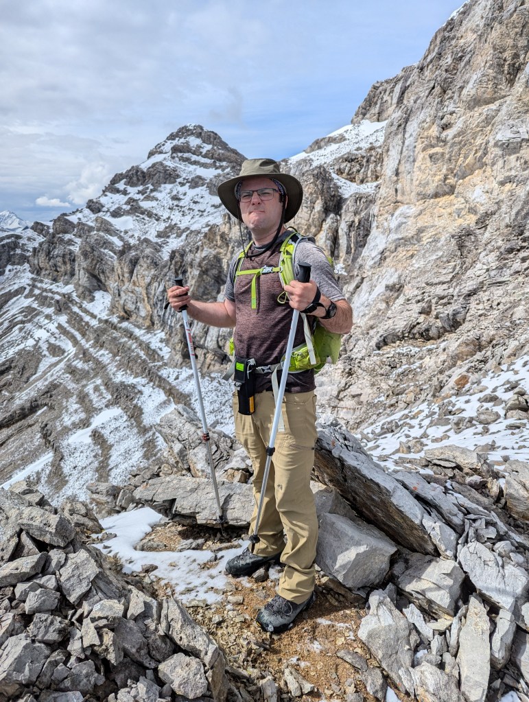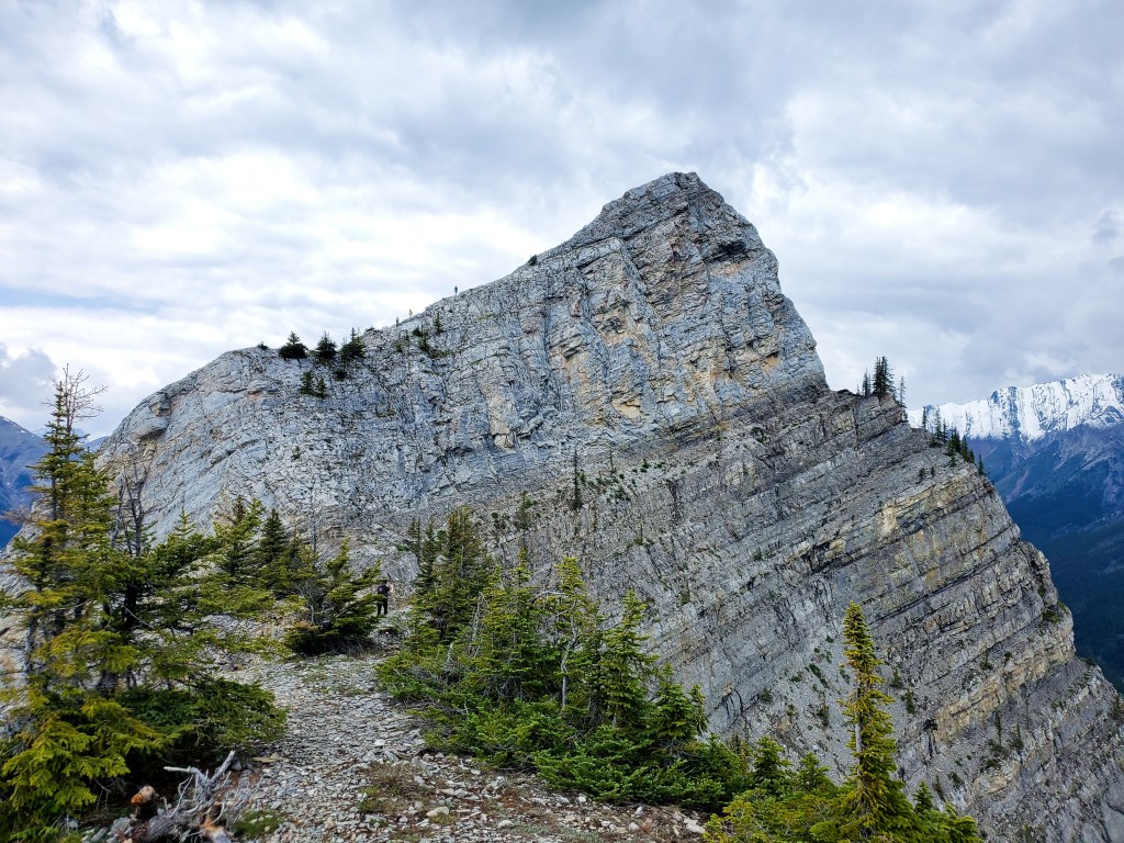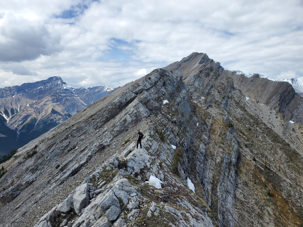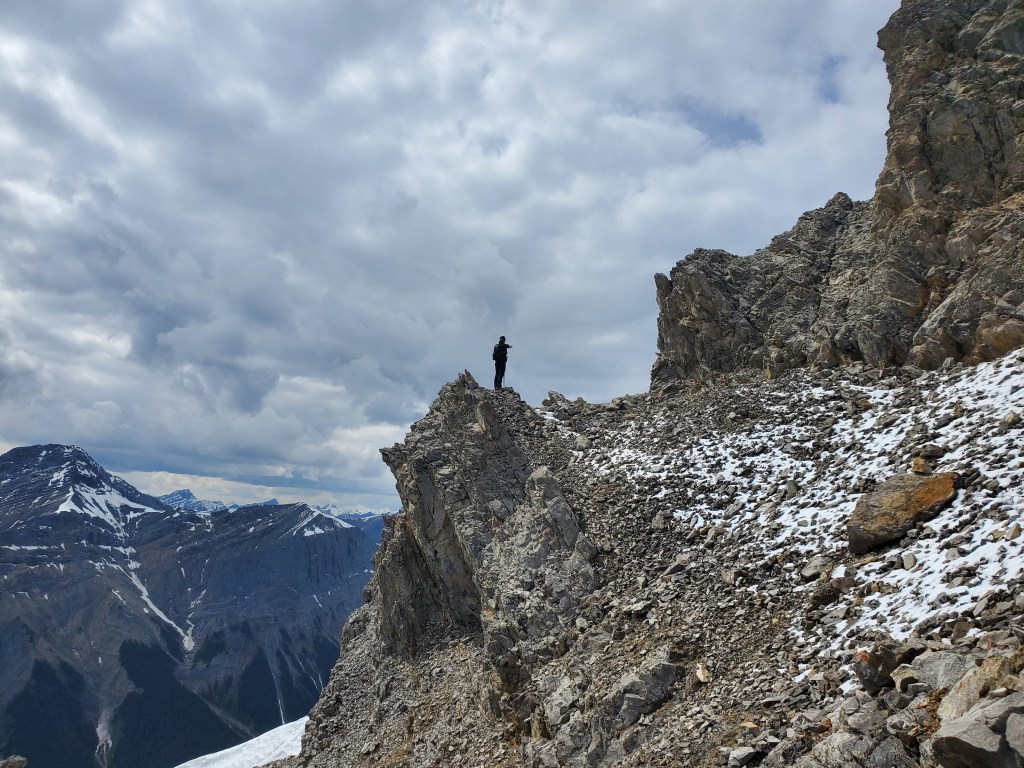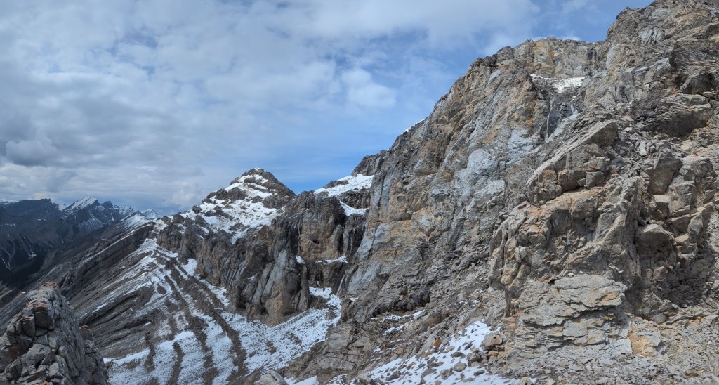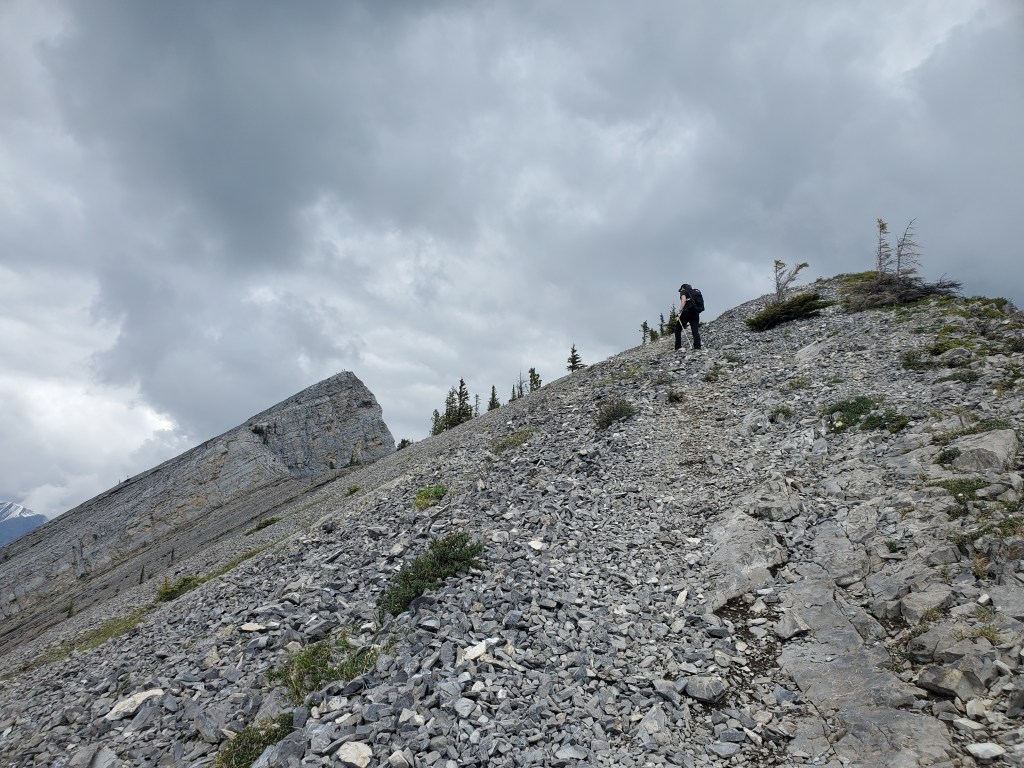 I believe this is the third highest point on the ridge and what Pawlyk describes as the “true summit just poking out” in his photo (or what I describe further on as the pinnacle) is the second highest peak. The true summit is still quite far back from here.The correct line for reaching the second/third highest point on the ridge is this way.Working our way up and over the second/third highest point, the pinnacle that will soon stop us comes into view.The cliffs to the right side of the pinnacle looked impassible, but the scree slope around the left side offered a glimmer of hope. I scouted ahead to see if the line would go (tiny black dot midway across the slope).This was where Dan caught up with me, still squinting ahead to see if any lines looked promising. And here’s the view that had me so engrossed. The peak is just out of view to the right.Dan for scale.By this point we were half an hour from our turn-around time and any route option, if it worked at all, would take more than half an hour. So, we instead used the time for a snack break before returning the way we came.One last look back at the pinnacle, somehow hoping the right-hand side will look less terrible this time. It doesn’t.The ridge walk back out is no faster than the hike in. Slab sections can be bypassed, but the terrain is worse quality lower down. Sticking to the ridge proved to be the easiest line.Downclimbing the cliff in front of the scramblers’ summit. The hikers’ summit is just in front of me.Looking back at Dan, effectively camouflaged in grey-on-grey, as he walks down the cliff from the scramblers’ summit. It’s easier than it looks!