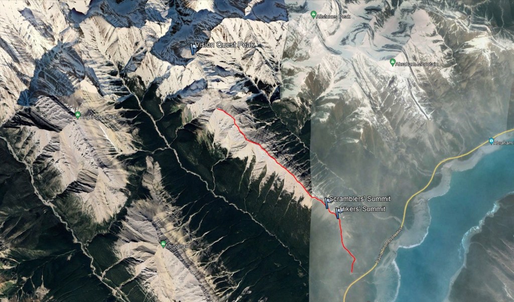 Notes: Pawlyk’s description is to the second/third-highest point on the ridge only. Beyond this a pinnacle blocks the ridge, ~0.5 km before the peak. A bypass may be possible, but we’d reached our turn-around time.
