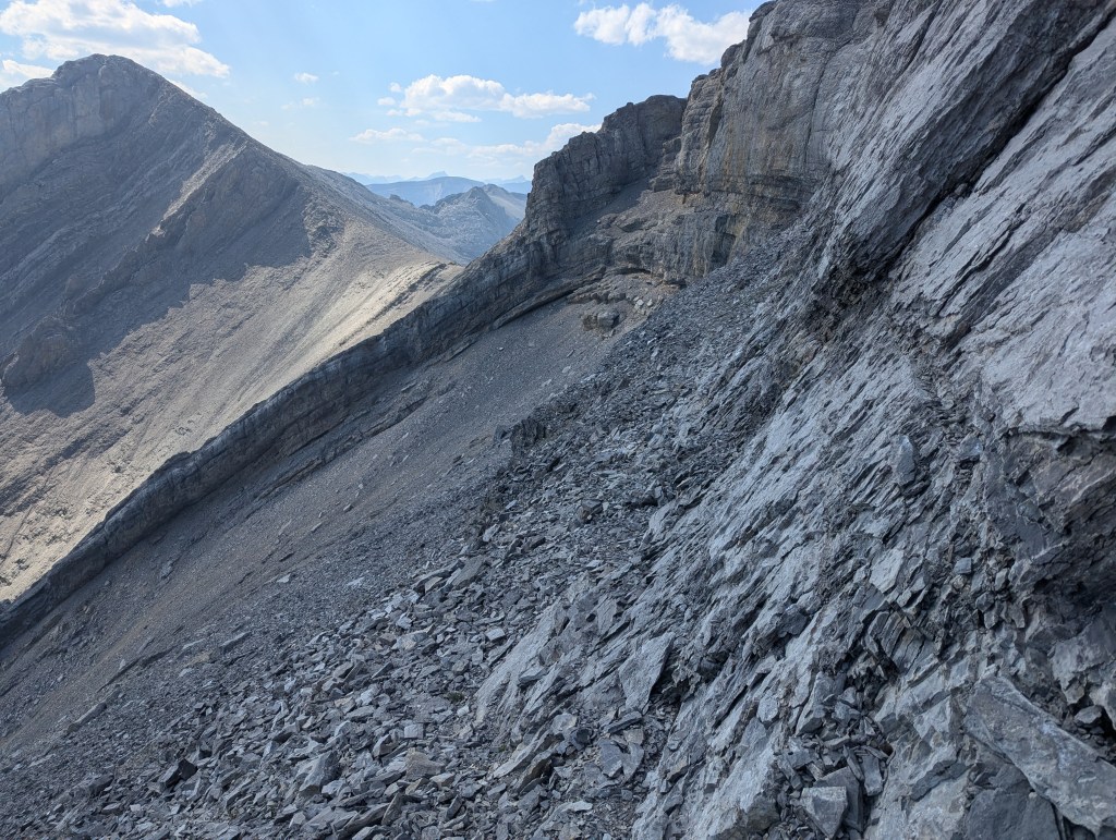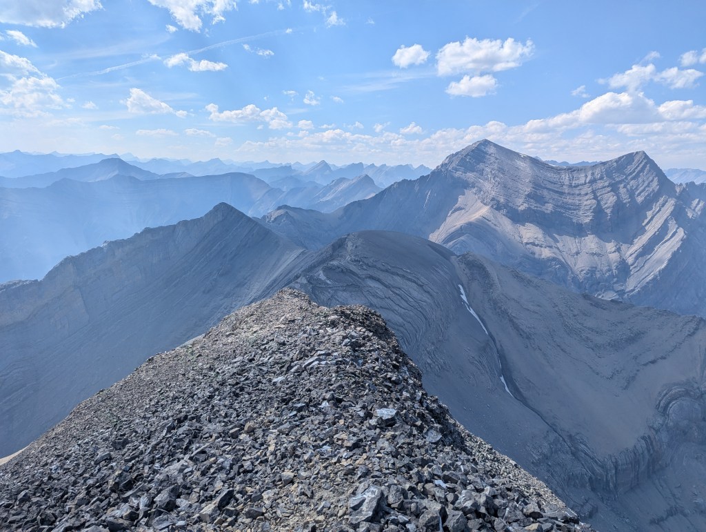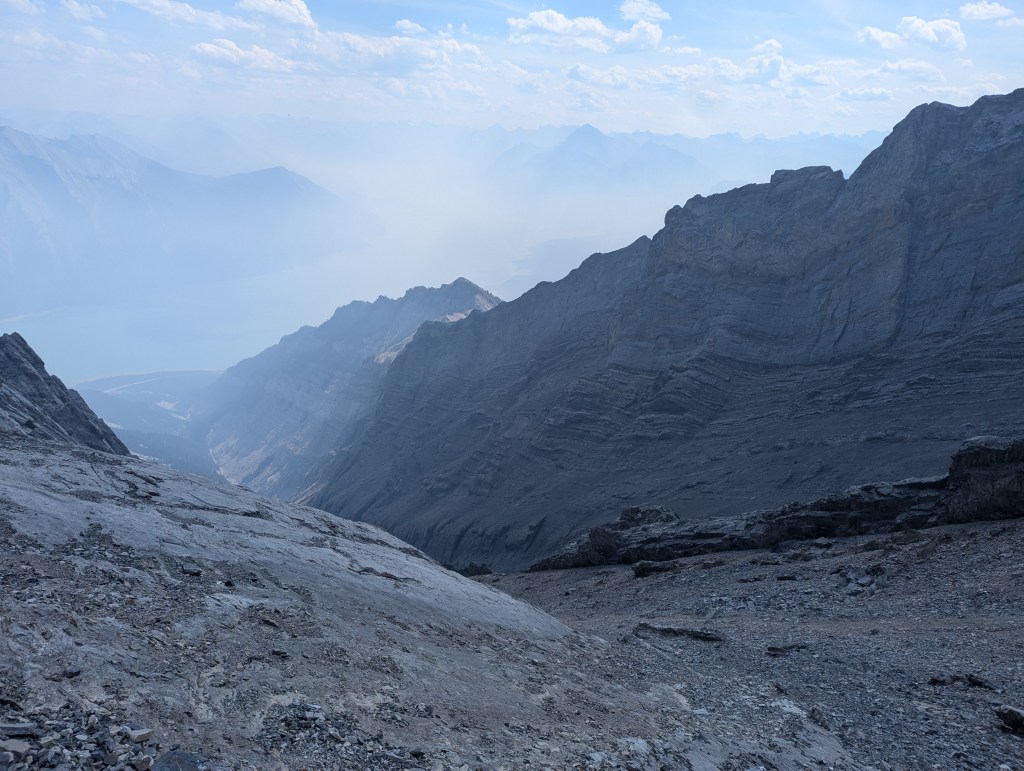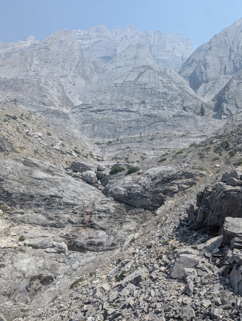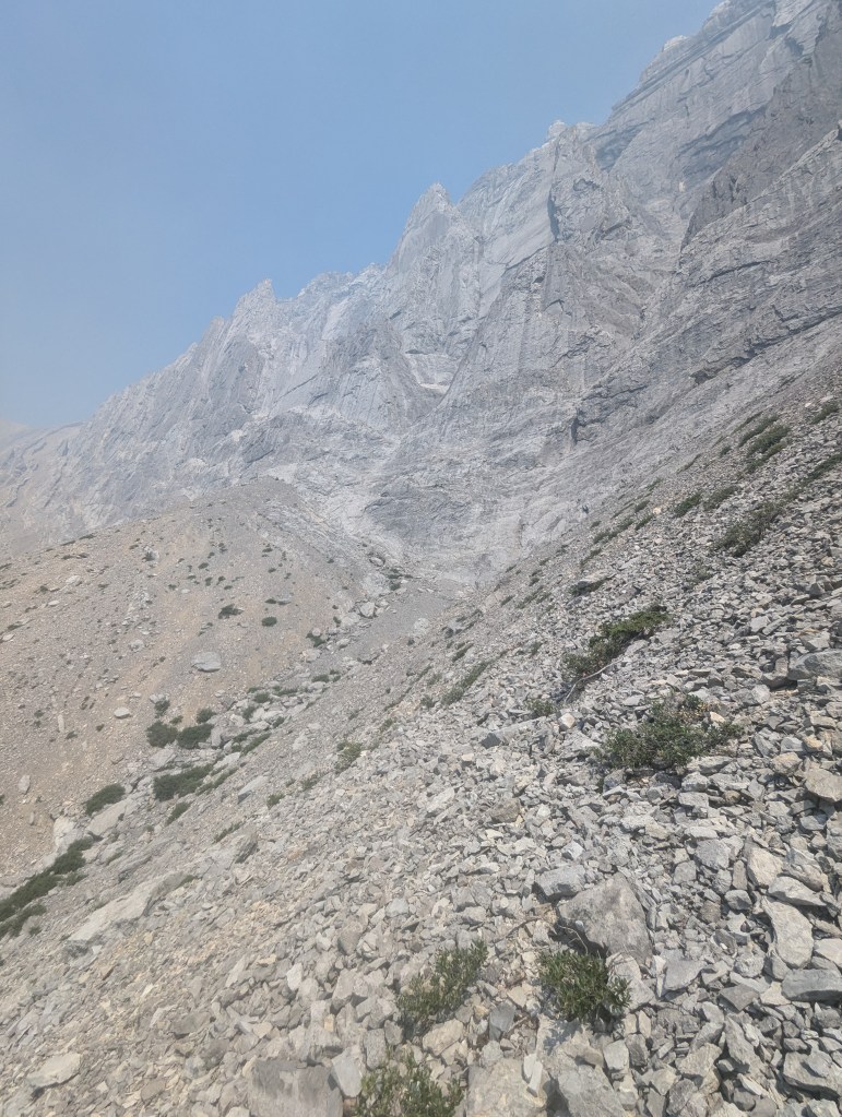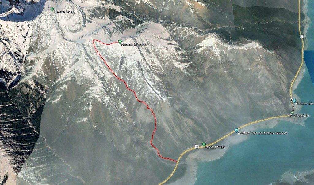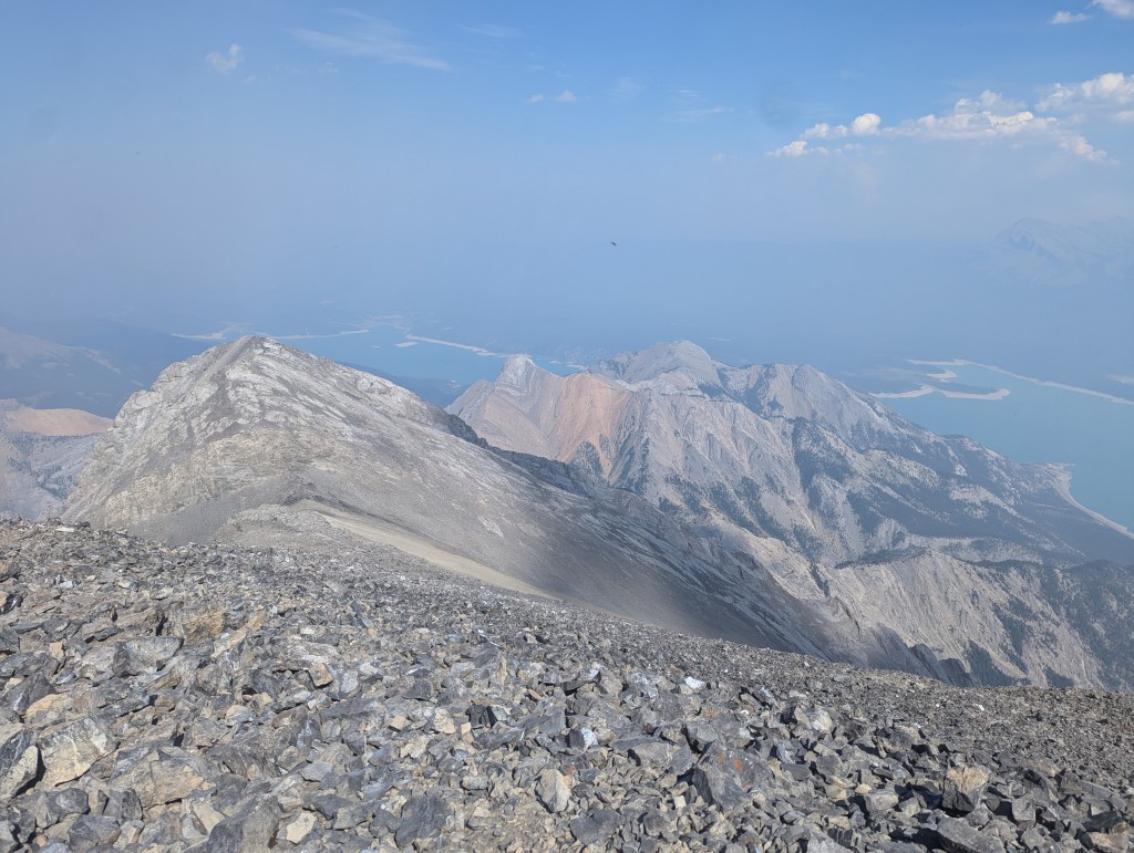 The view of Abraham Mountain from where I parked on the road. The creek approach starts at the right side of this photo, near the diamond-shaped road sign. A faint trail leads to the treed hump at the center of the photo, gaining which leads to the base of the cliffs. A tedious traverse below the cliffs leads to the col at the left side of the mountain. The final push from the col to the peak is shorter than it looks from this angle.There was a faint trail to follow on high ground to the right of the creek.The trail seems to end at a washout featuring still-forming hoodoos. I kept high and hiked behind the burgeoning hoodoos, turning right at flagging tape along the edge of a small gravel drainage. The trees along the drainage were thin and easy to navigate for the trek up. On the way down, the gravel drainage made for a faster descent at times. Steep parts of the drainage higher up are easily bypassed in trees to climber’s left (cairns and faint trails).Trending too far left only leads to slabby cliffs. The slab ahead is steep and exposed with a loose dusting of gravel – not a viable route option. Instead I continued up through the trees until I was above this large network of slabby drainages. Surprisingly, I ran into another group at the top of this slope who had hiked in via Abraham Slabs.Once above the slabby cliffs, a long traverse cross many drainages begins. This is the first one encountered. An ok-looking line exists midway up this photo. But, I was scrambling solo and opted for the absolute easiest possible line, requiring a bit of elevation loss.At this next drainage I, again, dropped down for the easiest crossing. Not far from here a section of steep, bald slab is encountered and the only obvious line is to gain elevation and cross on an easy shelf above the slab. For all other drainages I lost elevation at each crossing.The drainage with this scree chute marks the end of technical terrain for the traverse. Beyond this point it’s less critical to keep high and game trails exist lower on the slope to ease progress.Crossing yet another drainage. The broad gravel drainages further back on the mountain seemed to require slightly less elevation loss and regain if crossed slightly lower down on game trails, as opposed to hugging the cliff.Looking ahead, the scree slope leading to the col on the summit ridge looks to be getting closer. The ascent slope is at center, just above the drainage.But first, another two drainages must still be crossed.I started up the scree slope a little over three hours into the trip, feeling like I was doing alright for time. The terrain at the right side is relatively stable, far from the worst I’ve done. This is roughly where I began rationing my water.My forced smile betrays my true feelings here: I spent two hours groveling up this scree slope. Two additional drainages are crossed within the scree slope, requiring elevation loss and regain each time. The route is largely sheltered from any breeze and I was baking in the hot sun. The scree slope eventually ended, despite my fears that I would reach my turn around time still dragging myself up this endless slope. Looking back, the day that had started with fairly clear skies had now darkened from the smoke of wildfires to the north.As the scree slope curves around to the right, a subtle ramp can be spotted to climber’s left, leading to the summit ridge.Looking back from the same point as the photo above. The scree slope, my ascent slope, rises from the bottom-left corner, below the cliffs.Once upon the summit ridge, the path to the summit came into view. It’s only 30 min to the peak from here. The walk isn’t quite as trivial as this view would indicate, but I did feel it stayed within the realm of moderate scrambling. There was one move of downclimbing to climber’s right that felt a bit airy, but was sheltered above a small shelf. If at all damp or snowy though, this ridge would be too exposed to attempt without a rope, ice axe, and crampons.A smoky summit panorama, looking across Abraham Lake. Mount Michener stands at center.Looking northwest to Allstones Peak (not to be confused with the peak of Allstones Ridge), easily the highest point in the corridor.To the east lies the fun little loop of Windy Ridge, The Buckle, Talus Peak, and Humpback Ridge. The closer ridge at the right is Hoodoo Ridge. Despite appearances from this angle, it does not connect with this route.Victory selfie at the peak of Abraham Mountain. No sunburns were had on this day, thanks for asking!The descent back down the scree slope was virtually effortless compared to the ascent. Smoky skies had cleared somewhat by this point. The sun had shifted now, too, creating a good shaded break. By the bottom of the slope though, I had unfortunately run out of water. By mid-summer this route has no drinkable water sources, and the 2 L I had started out with did not last the full trip.The traverse back out across the many drainages was no faster than on the way in. My GPS watch proved handy for spotting the turn-off to my ascent drainage. Without a navigation aid, the walk-off via Abraham Slabs is probably the more intuitive line.