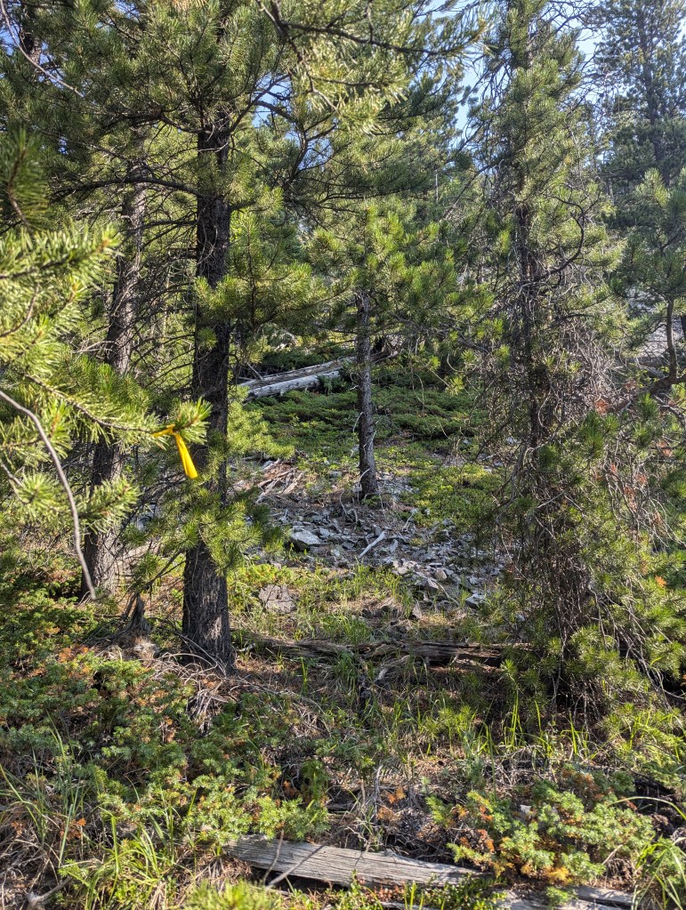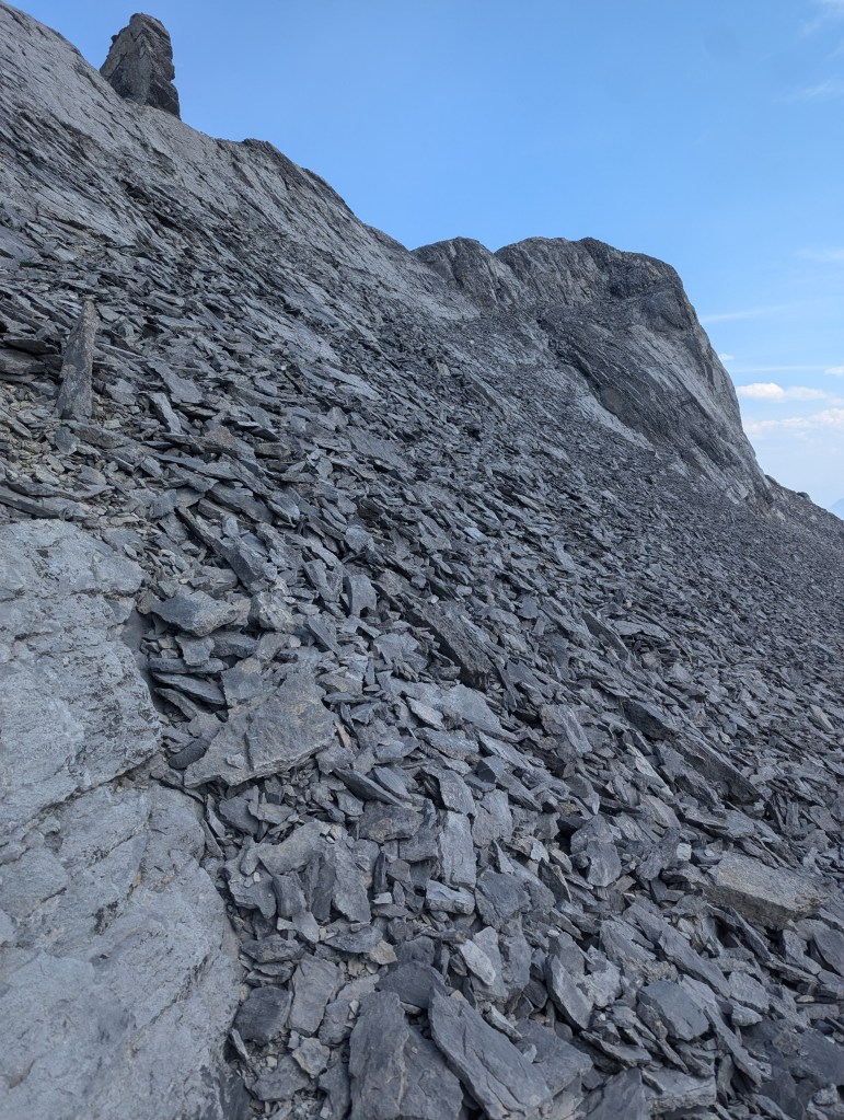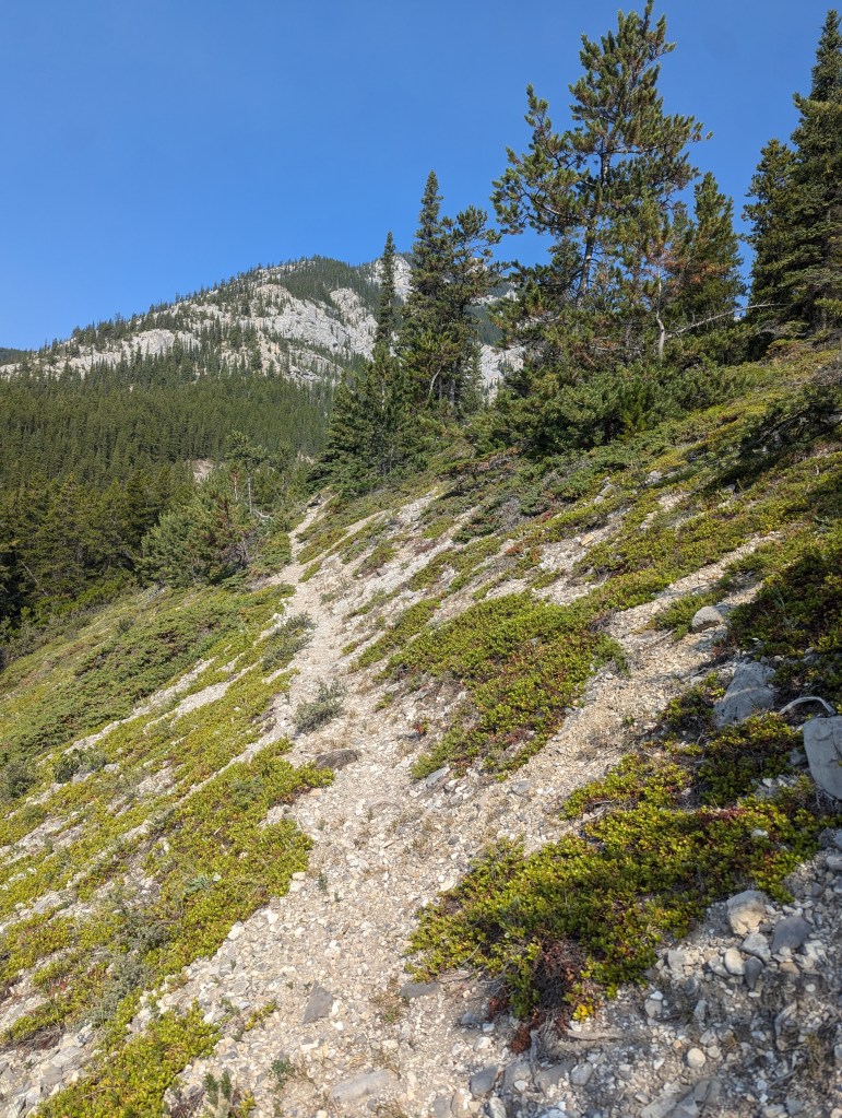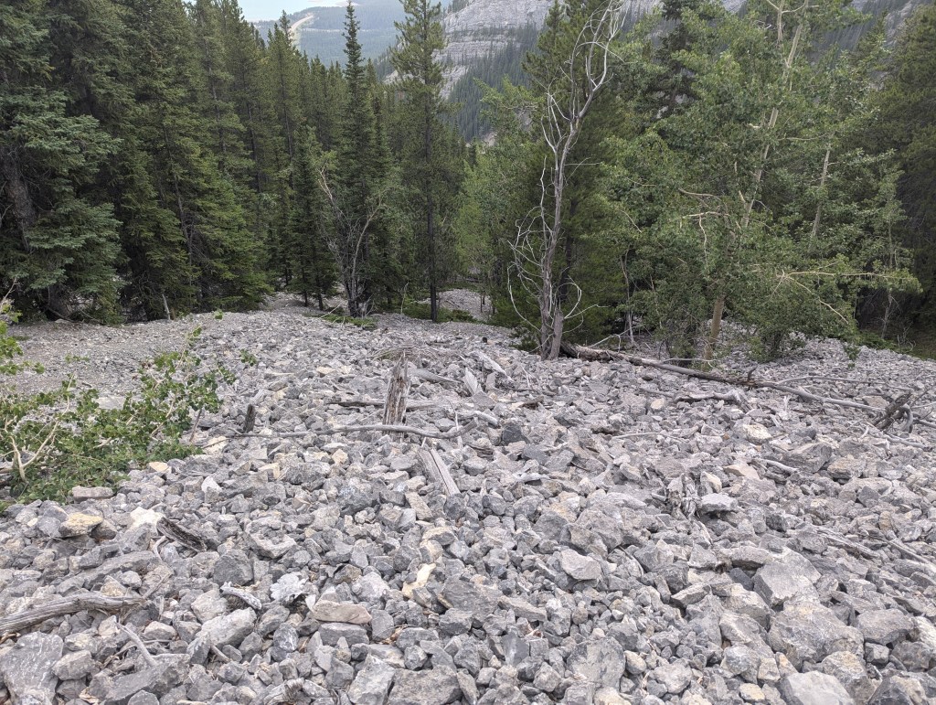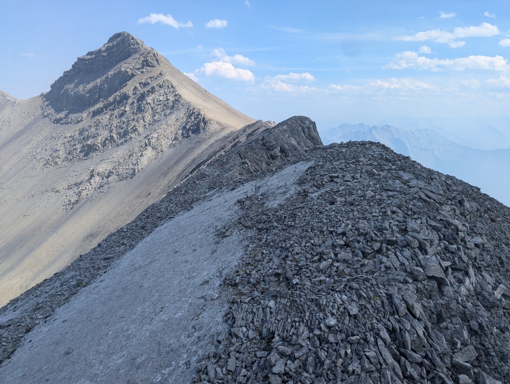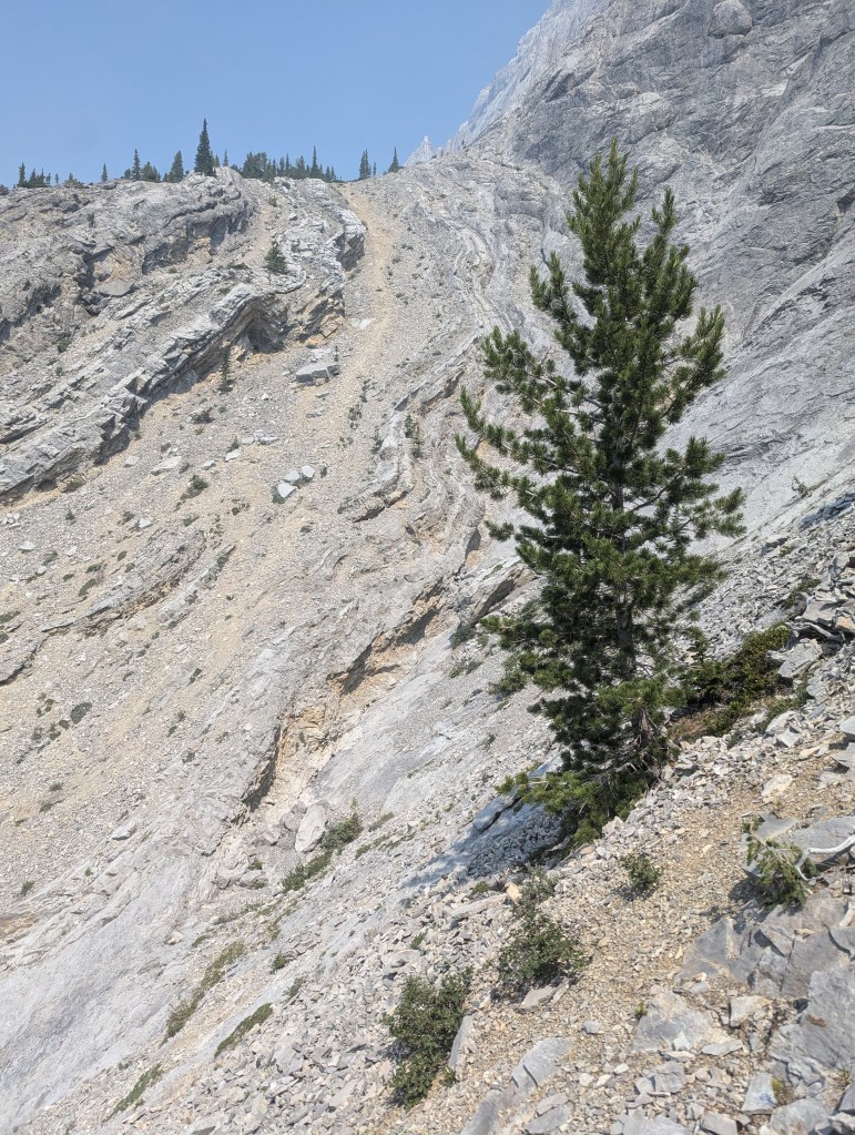 The view of Abraham Mountain from where I parked on the road. The creek approach starts at the right side of this photo, near the diamond-shaped road sign. A faint trail leads to the treed hump at the center of the photo, gaining which leads to the base of the cliffs. A tedious traverse below the cliffs leads to the col at the left side of the mountain. The final push from the col to the peak is shorter than it looks from this angle.There was a faint trail to follow on high ground to the right of the creek.The trail seems to end at a washout featuring still-forming hoodoos. I kept high and hiked behind the burgeoning hoodoos, turning right at flagging tape along the edge of a small gravel drainage. The trees along the drainage were thin and easy to navigate for the trek up. On the way down, the gravel drainage made for a faster descent at times. Steep parts of the drainage higher up are easily bypassed in trees to climber’s left (cairns and faint trails).Trending too far left only leads to slabby cliffs. The slab ahead is steep and exposed with a loose dusting of gravel – not a viable route option. Instead I continued up through the trees until I was above this large network of slabby drainages. Surprisingly, I ran into another group at the top of this slope who had hiked in via Abraham Slabs.Once above the slabby cliffs, a long traverse cross many drainages begins. This is the first one encountered. An ok-looking line exists midway up this photo. But, I was scrambling solo and opted for the absolute easiest possible line, requiring a bit of elevation loss.At this next drainage I, again, dropped down for the easiest crossing. Not far from here a section of steep, bald slab is encountered and the only obvious line is to gain elevation and cross on an easy shelf above the slab. For all other drainages I lost elevation at each crossing.The drainage with this scree chute marks the end of technical terrain for the traverse. Beyond this point it’s less critical to keep high and game trails exist lower on the slope to ease progress.Crossing yet another drainage. The broad gravel drainages further back on the mountain seemed to require slightly less elevation loss and regain if crossed slightly lower down on game trails, as opposed to hugging the cliff.Looking ahead, the scree slope leading to the col on the summit ridge looks to be getting closer. The ascent slope is at center, just above the drainage.But first, another two drainages must still be crossed.I started up the scree slope a little over three hours into the trip, feeling like I was doing alright for time. The terrain at the right side is relatively stable, far from the worst I’ve done. This is roughly where I began rationing my water.My forced smile betrays my true feelings here: I spent two hours groveling up this scree slope. Two additional drainages are crossed within the scree slope, requiring elevation loss and regain each time. The route is largely sheltered from any breeze and I was baking in the hot sun. The scree slope eventually ended, despite my fears that I would reach my turn around time still dragging myself up this endless slope. Looking back, the day that had started with fairly clear skies had now darkened from the smoke of wildfires to the north.As the scree slope curves around to the right, a subtle ramp can be spotted to climber’s left, leading to the summit ridge.Looking back from the same point as the photo above. The scree slope, my ascent slope, rises from the bottom-left corner, below the cliffs.Once upon the summit ridge, the path to the summit came into view. It’s only 30 min to the peak from here. The walk isn’t quite as trivial as this view would indicate, but I did feel it stayed within the realm of moderate scrambling. There was one move of downclimbing to climber’s right that felt a bit airy, but was sheltered above a small shelf. If at all damp or snowy though, this ridge would be too exposed to attempt without a rope, ice axe, and crampons.A smoky summit panorama, looking across Abraham Lake. Mount Michener stands at center.Looking northwest to Allstones Peak (not to be confused with the peak of Allstones Ridge), easily the highest point in the corridor.To the east lies the fun little loop of Windy Ridge, The Buckle, Talus Peak, and Humpback Ridge. The closer ridge at the right is Hoodoo Ridge. Despite appearances from this angle, it does not connect with this route.Victory selfie at the peak of Abraham Mountain. No sunburns were had on this day, thanks for asking!The descent back down the scree slope was virtually effortless compared to the ascent. Smoky skies had cleared somewhat by this point. The sun had shifted now, too, creating a good shaded break. By the bottom of the slope though, I had unfortunately run out of water. By mid-summer this route has no drinkable water sources, and the 2 L I had started out with did not last the full trip.The traverse back out across the many drainages was no faster than on the way in. My GPS watch proved handy for spotting the turn-off to my ascent drainage. Without a navigation aid, the walk-off via Abraham Slabs is probably the more intuitive line.