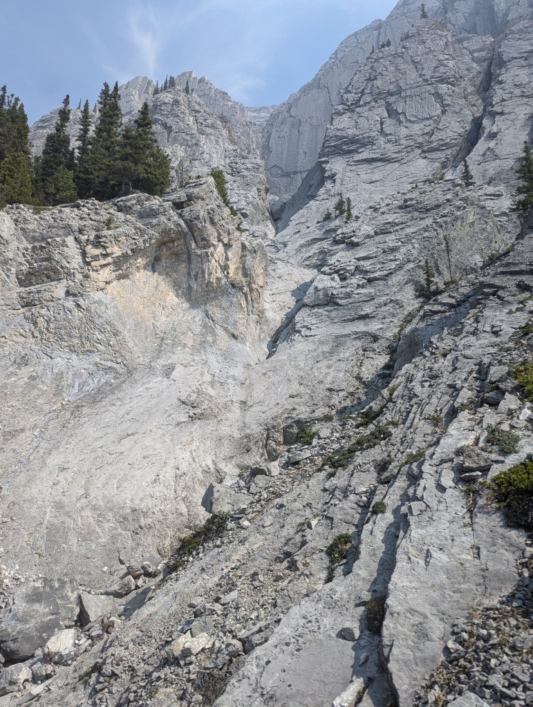 Based on experience at Abraham Slabs, sheep seem to enjoy hanging around the upper slopes and make sport of kicking rocks down at climbers. With this in mind, I kept my helmet on any time I was near the cliffs. With the presence of sheep I would also expect ticks. I didn’t find any on this day, but have seen plenty around neighbouring Windy Point in Spring.