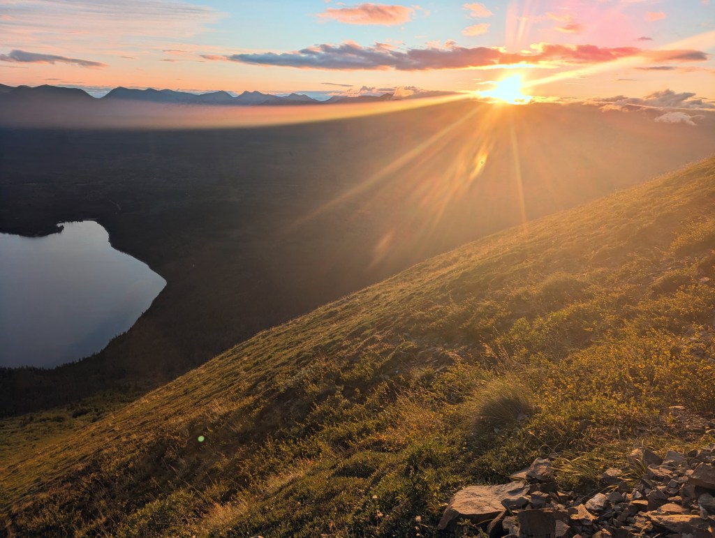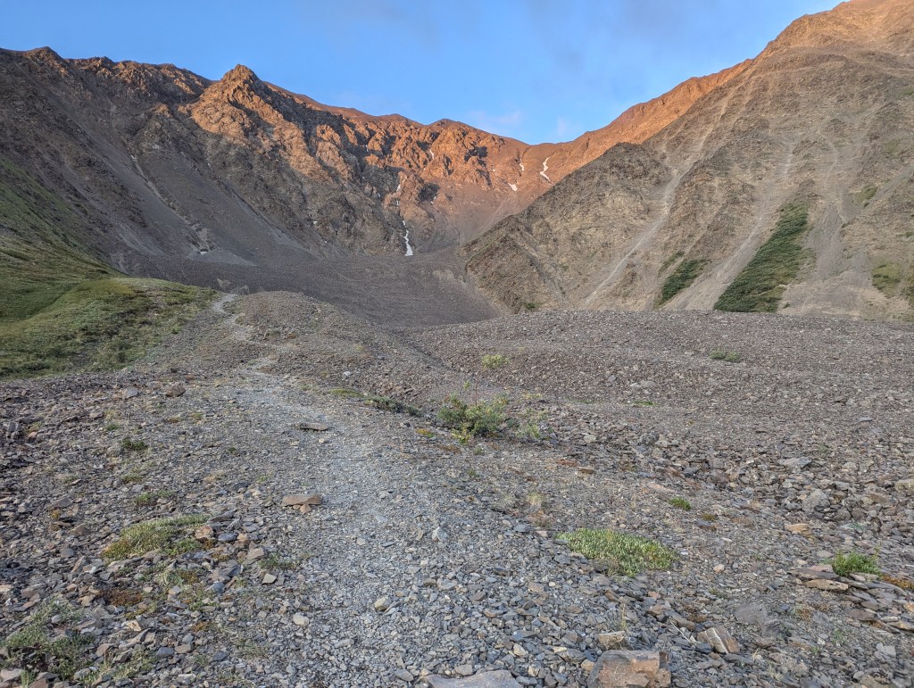 King’s Throne, as seen from the shores of Kathleen Lake the previous evening. The seat of the throne is roughly at center. The trail begins by gaining the seat, then heads left up the chair arm, before traversing across the back of the throne to the peak (right).