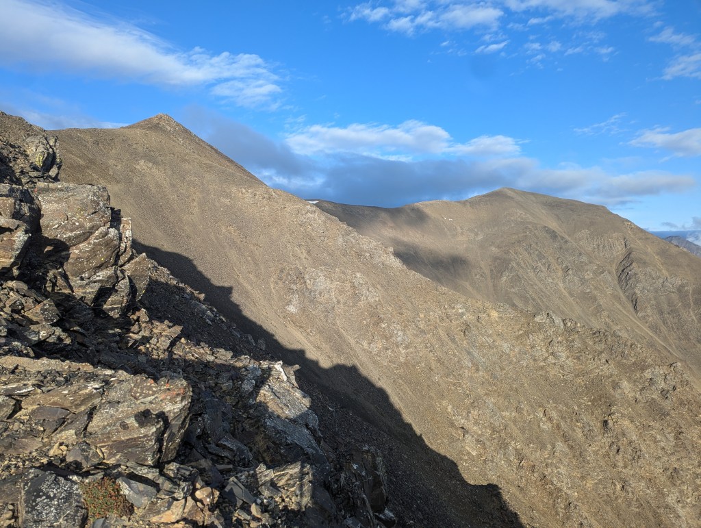My reward for the early start was reaching tree line just as the sun was rising. This shot is looking north across Kathleen Lake. The route up to this point is a well-treed trail with good signage.Continuing south into the seat of the throne. The trail turns left just ahead, making use of the grassy slope.Starting up the grassy slope toward the arm of the throne, ever rewarded with expanding views of the sunrise. The trail gets steeper and more rocky near the top of the arm, but it’s never beyond easy scrambling.A phenomenal sunrise from the arm of King’s Throne.Opposite to the rising sun, looking west across Kathleen Lake.Looking west across the back of the throne (left) to the peak (right).Views over Dezadeash Lake to the east, with its fluffy morning clouds.A good trail leads along the back of the throne, keeping to its gentle south slopes.The well-worn trail continues to the peak (center). This portion is barely more difficult than walking. Clouds that had been gathering over me broke just as I neared the peak, urging me on before my window of sunshine passed. I reached the peak at 8:30 AM, 3 1/2 hours from the trailhead.Summit panorama from the peak of King’s Throne.Looking west across Kathleen Lake.Looking east across Dezadeash Lake.As appealing as the summit views were, I was keen to begin my descent before the rain hit and I promptly started back. Ahead (south) lies Dalton NW7, a fun-looking peak that could be combined with King’s Throne (time permitting).Making my way back down the well-worn scree trail. This line leads into the grassy ascent slope.