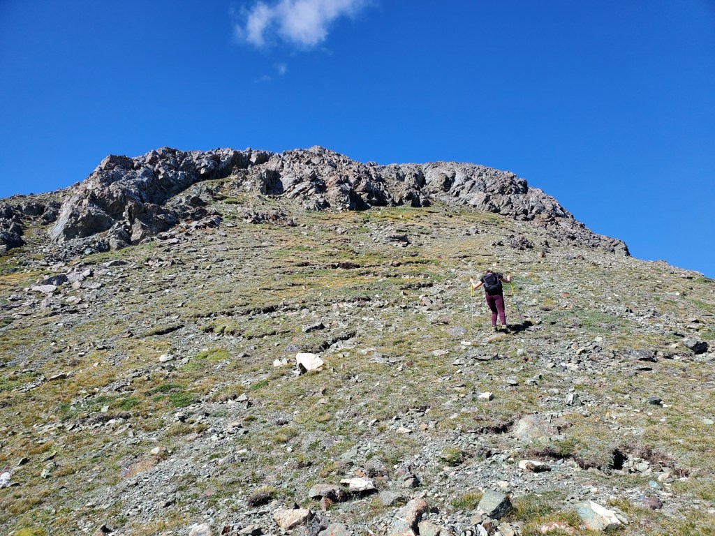 Instead of gaining the summit ridge, we circled around to the back side, picking up easy sheep trails. From the top of the drainage, look for a pinnacle where the trail starts.