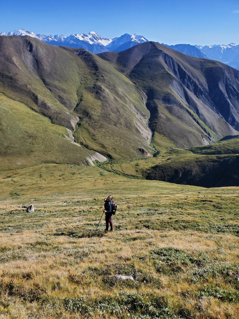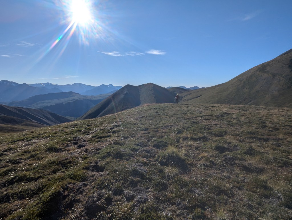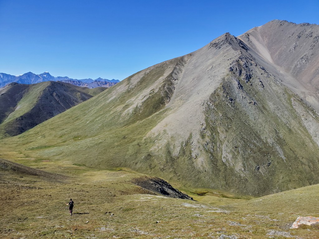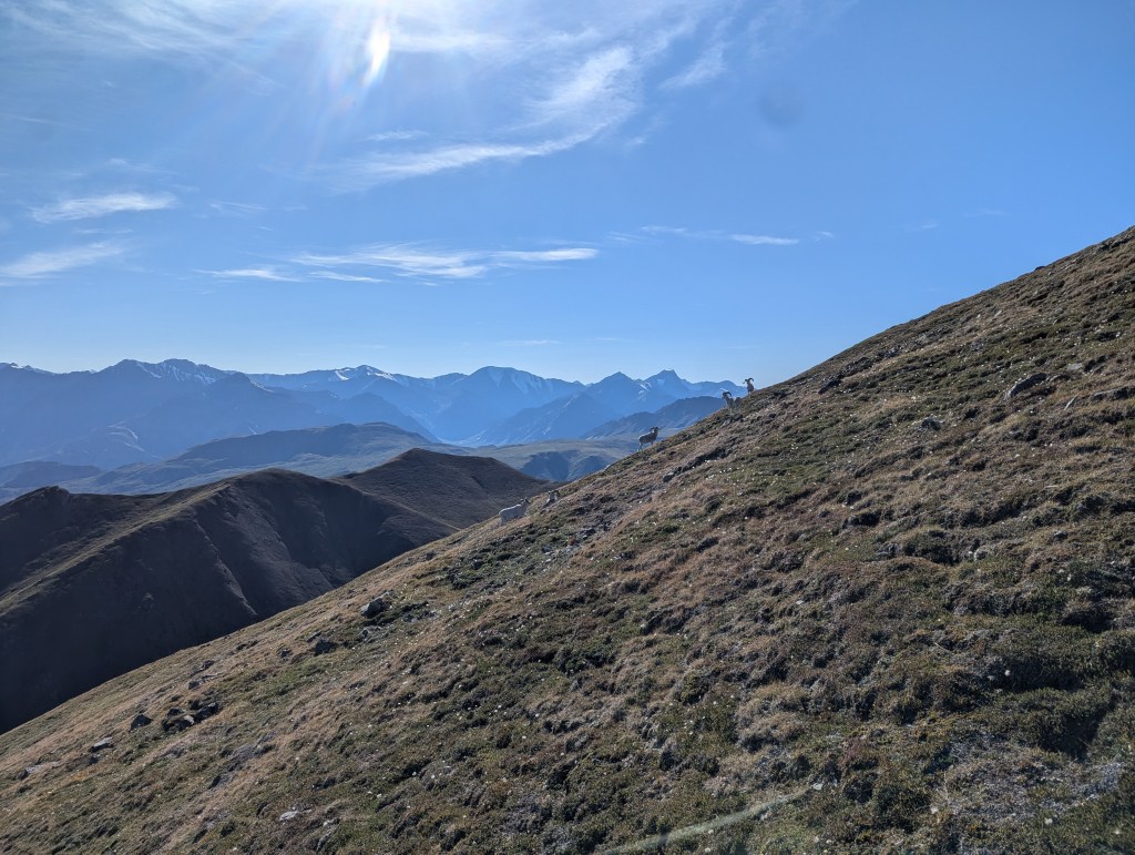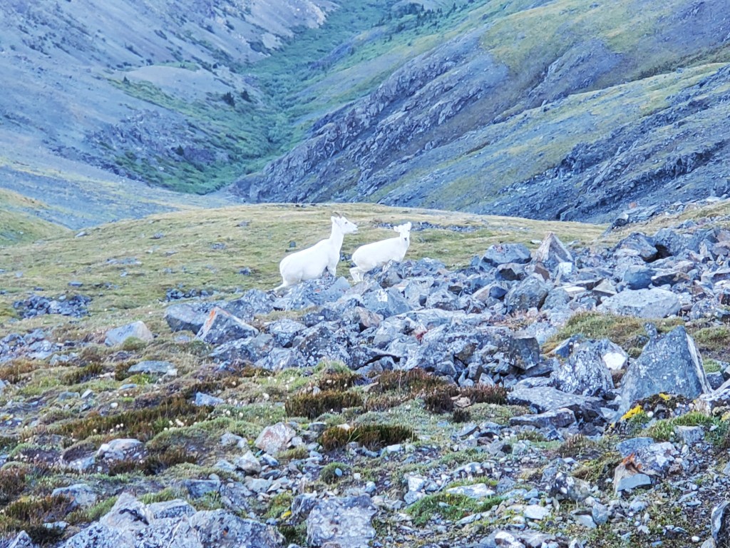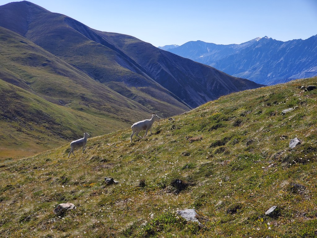 Thechàl Dhâl, also called Sheep Mountain, is a popular hike in Kluane National Park and Reserve and is well-known for its Dall’s Sheep. I was excited for the experience and very much hoping to catch a glimpse of one sheep. We ended up hiking past well over one hundred Dall’s Sheep! Try as we might to plot a course well around the larger flocks, individual sheep showed up everywhere we turned (becoming a mild nuisance to navigate around). The sheep usually favour the south slopes of Thechàl Dhâl, but I suspect a storm the previous day had sent them to the sheltered north slopes where we were hiking.