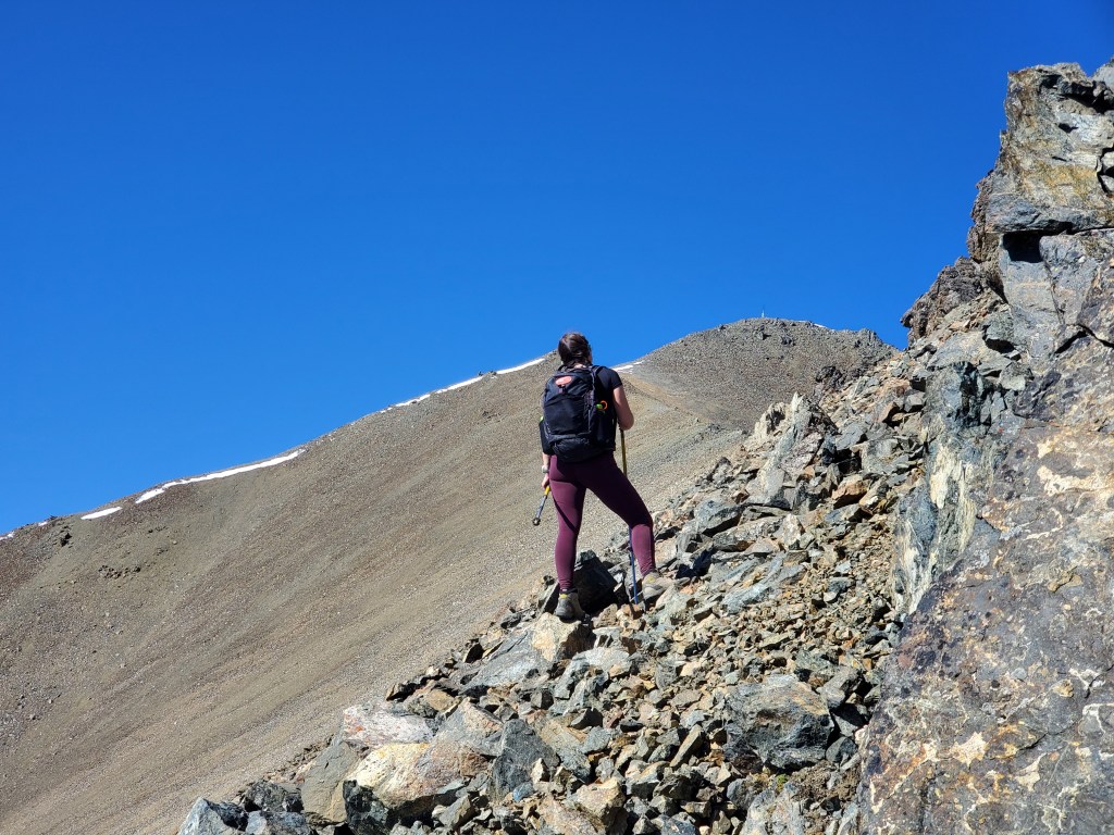 This hike can be done as an out-and-back or as a through-hike with vehicles parked at either end. We didn’t have a second vehicle, so elected for the former. Neighbouring Mount Wallace can be added on to the trip but is not described in the book and requires a bit of route finding. There are two possible starting points from the east end of Thechàl Dhâl. We kept to Marjanovic and Marjanovic’s description and started at the Soldier’s Summit trailhead. This is described as being the slightly harder option, but we still found it quite easy. We were careful to watch for our turn-off on descent, as the trail continuing straight down to the alternate trailhead is more obvious when returning.