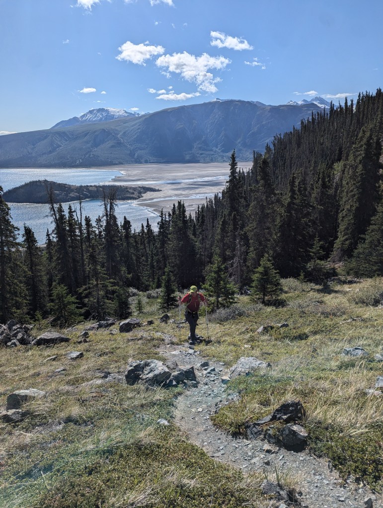 The first part of the trail is shared with Soldier’s Summit Trail and follows the original Alaska Highway. The modern Alaska Highway is now just to the right and below this, along the shores of Kluane Lake.