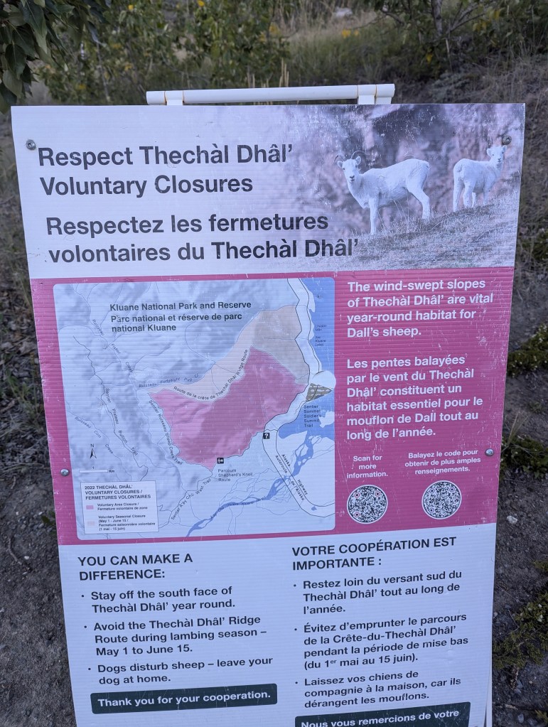 • Notes: Annual area closure to protect Dall’s Sheep: May 1 to June 15. Keep at least 50 m away from sheep all year.