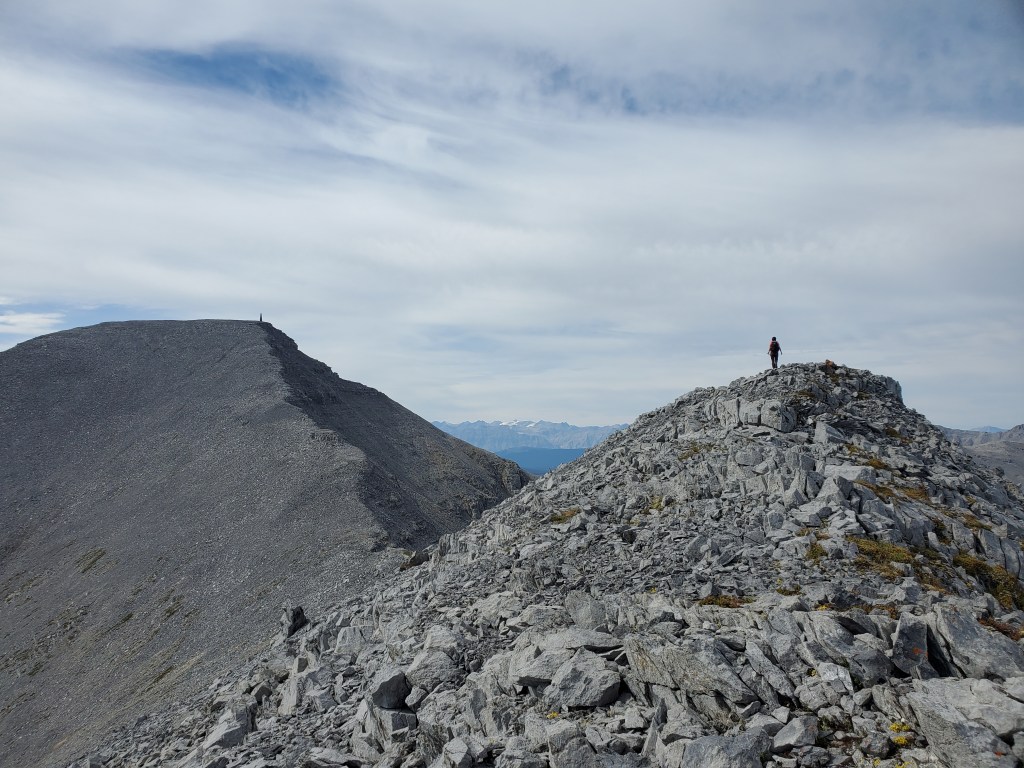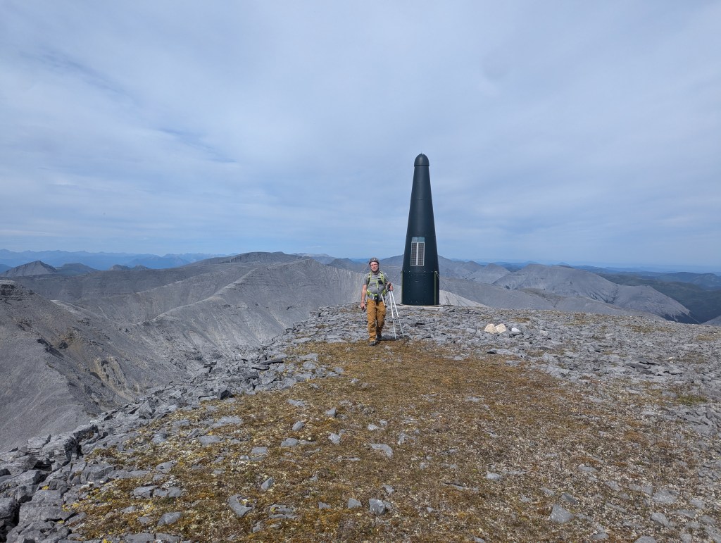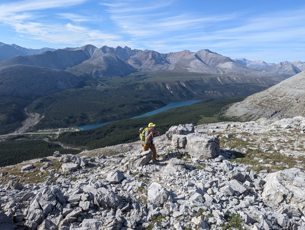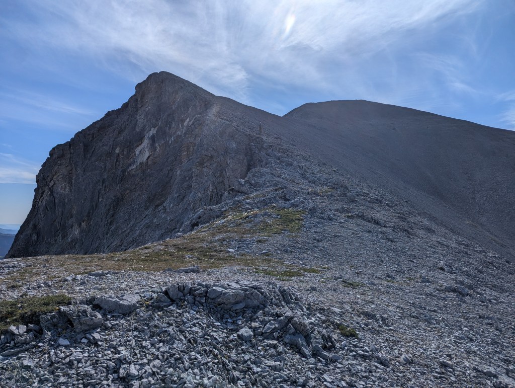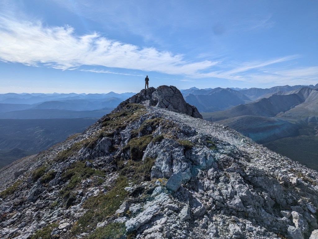 We’d been able to dig up a bit of information on the objective in advance, but this billboard at the trailhead gave us all of the information we needed. Interestingly, as of 2024, the version of this map on their website only shows the route up to Summit Peak.The day starts on a good trail along a creek. Caught in this photo: the black flies in this part of the province are terrible. They didn’t bother me very much while hiking, but they ate me alive while relaxing at our campsite.After about 20 min of hiking along the creek we turned up the slope toward Summit Peak. One creek crossing was required, but it was no trouble at all in August water levels.The hiking trail ingeniously winds its way through cliff bands without requiring hands-on scrambling. The way is marked by many cairns.Looking back at Summit Lake and Mount St George. The campground can be seen to the left of the lake.Looking ahead as we approach the viewpoint. This high point ahead is the first of the three stars on the map at the trailhead.Looking back, Dan nears the viewpoint.A small cairn marks the top of the viewpoint, but the second star on the map, Summit Peak, isn’t much further ahead so we breezed past. Taking a break at Summit Peak before continuing on.Summit panorama from Summit Peak.A fair chunk of elevation loss and regain (300 m) from Summit Peak is required to continue the ridge walk around to Mount St Paul. The peak, and the third star on the map, is seen at the left.Looking back as Dan descends Summit Peak. The excellent trail leading to Summit Peak dwindled here, but the way was obvious and we continued on.At the bottom of the dip between the two peaks. We will continue the ridge walk route by gaining the slope to the right, but it looks like the most direct path would be straight ahead to the low spot in the ridge. The scree on these slopes is decent quality and I would expect the line to be easy. The peak of Mount St Paul is to the left.Looking back at Summit Peak as we make our way up to the ridge of Mount St Paul.Continuing along the ridge and nearing the summit, marked by a tall green structure.Looking back toward the highway, Summit Peak is at the left. Rather than returning the way we came, we will follow the ridge at the right, forming a loop back to the creek.Dan reaching the peak of Mount St PaulA quick selfie at the peak before beginning our descent.Picking my way down the rocky ridge, back toward the creek. This was never beyond easy scrambling.Unfortunately as we made our way down the toe of the ridge, Dan managed to step awkwardly and aggravate an existing ankle injury. He still hiked himself out, we just slowed our pace for the last two kilometers. We made it back to the highway in 7 hours, with plenty of time left in the day.We spotted a caribou along the highway while heading back to our campground. I had never seen one before this road trip and ended up seeing 8 over the week! I hope this little guy put some weight on before winter.