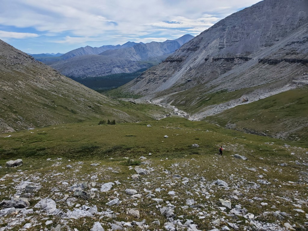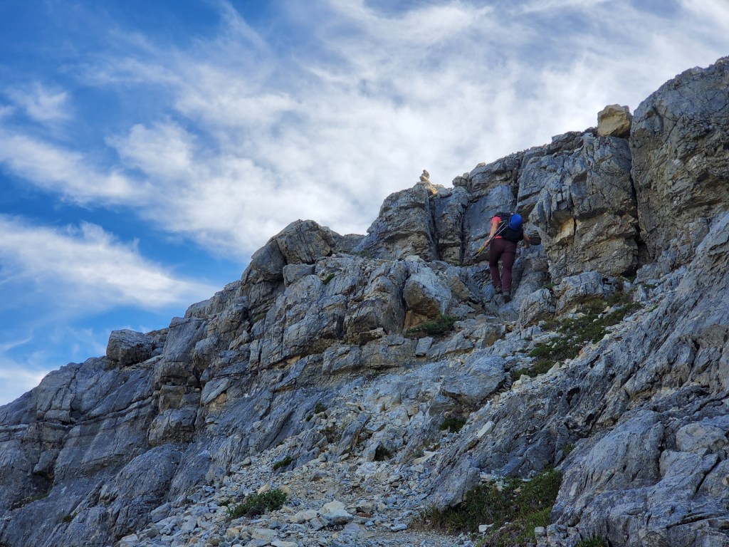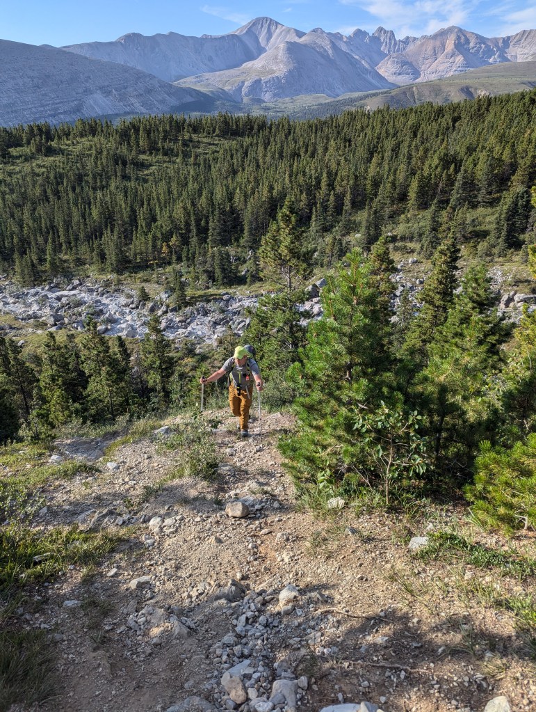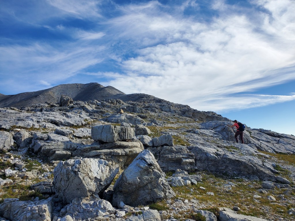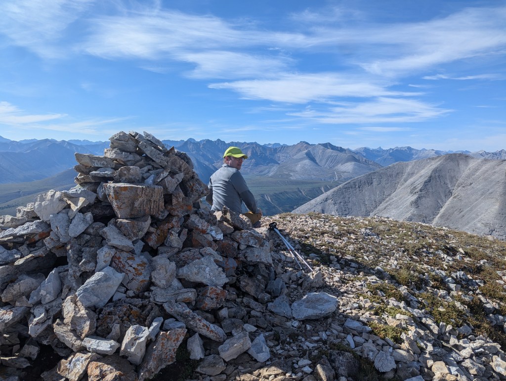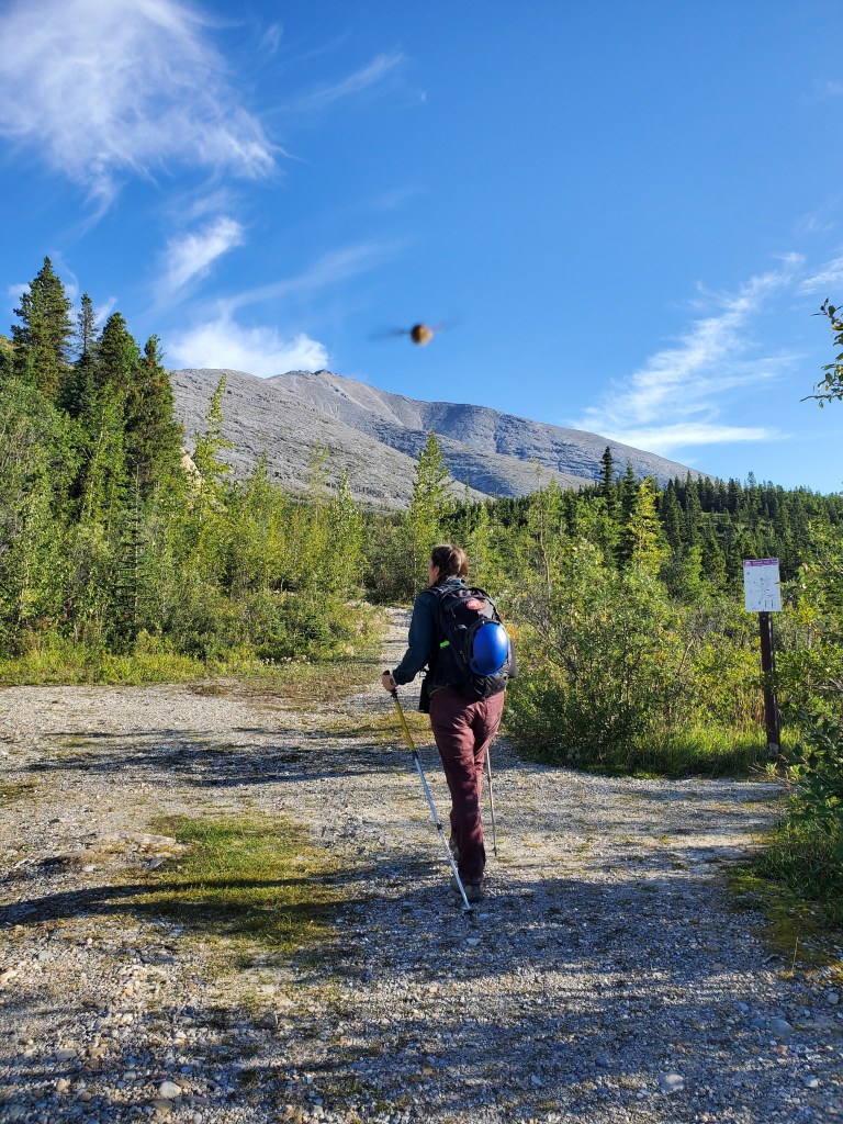 We’d been able to dig up a bit of information on the objective in advance, but this billboard at the trailhead gave us all of the information we needed. Interestingly, as of 2024, the version of this map on their website only shows the route up to Summit Peak.The day starts on a good trail along a creek. Caught in this photo: the black flies in this part of the province are terrible. They didn’t bother me very much while hiking, but they ate me alive while relaxing at our campsite.After about 20 min of hiking along the creek we turned up the slope toward Summit Peak. One creek crossing was required, but it was no trouble at all in August water levels.The hiking trail ingeniously winds its way through cliff bands without requiring hands-on scrambling. The way is marked by many cairns.Looking back at Summit Lake and Mount St George. The campground can be seen to the left of the lake.Looking ahead as we approach the viewpoint. This high point ahead is the first of the three stars on the map at the trailhead.Looking back, Dan nears the viewpoint.A small cairn marks the top of the viewpoint, but the second star on the map, Summit Peak, isn’t much further ahead so we breezed past. Taking a break at Summit Peak before continuing on.Summit panorama from Summit Peak.A fair chunk of elevation loss and regain (300 m) from Summit Peak is required to continue the ridge walk around to Mount St Paul. The peak, and the third star on the map, is seen at the left.Looking back as Dan descends Summit Peak. The excellent trail leading to Summit Peak dwindled here, but the way was obvious and we continued on.At the bottom of the dip between the two peaks. We will continue the ridge walk route by gaining the slope to the right, but it looks like the most direct path would be straight ahead to the low spot in the ridge. The scree on these slopes is decent quality and I would expect the line to be easy. The peak of Mount St Paul is to the left.Looking back at Summit Peak as we make our way up to the ridge of Mount St Paul.Continuing along the ridge and nearing the summit, marked by a tall green structure.Looking back toward the highway, Summit Peak is at the left. Rather than returning the way we came, we will follow the ridge at the right, forming a loop back to the creek.Dan reaching the peak of Mount St PaulA quick selfie at the peak before beginning our descent.Picking my way down the rocky ridge, back toward the creek. This was never beyond easy scrambling.Unfortunately as we made our way down the toe of the ridge, Dan managed to step awkwardly and aggravate an existing ankle injury. He still hiked himself out, we just slowed our pace for the last two kilometers. We made it back to the highway in 7 hours, with plenty of time left in the day.We spotted a caribou along the highway while heading back to our campground. I had never seen one before this road trip and ended up seeing 8 over the week! I hope this little guy put some weight on before winter.