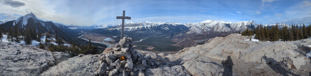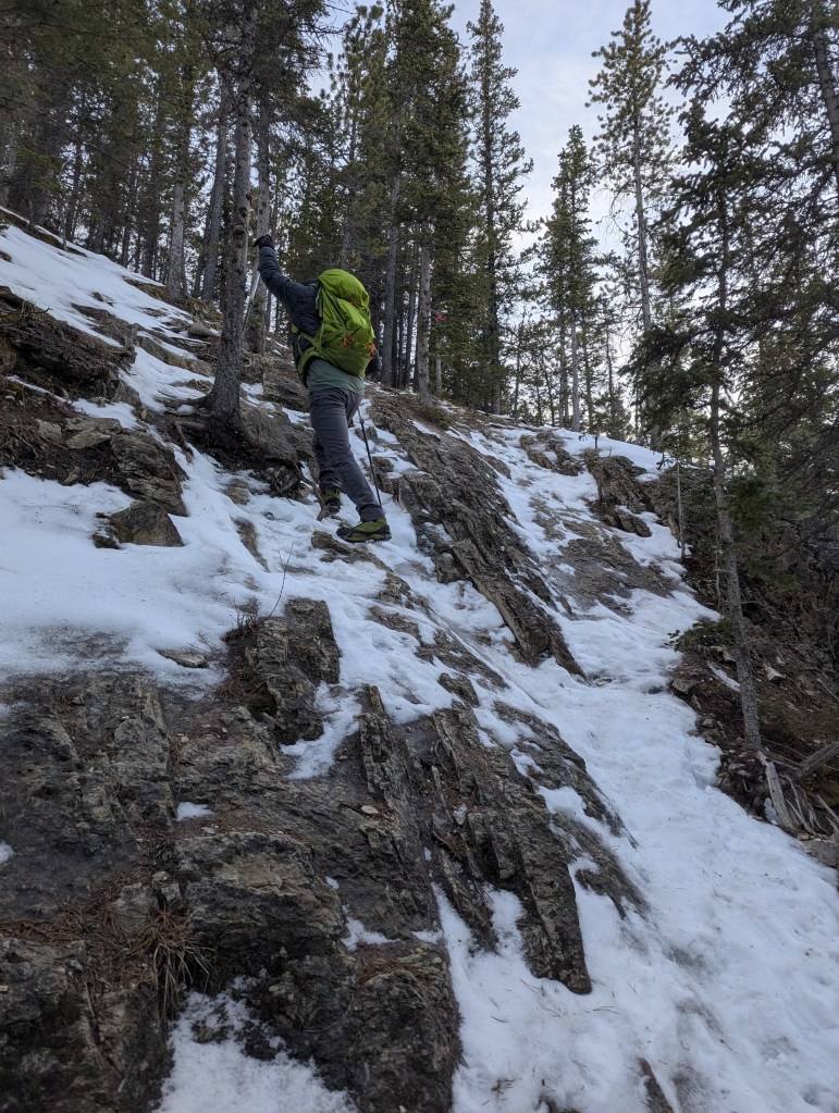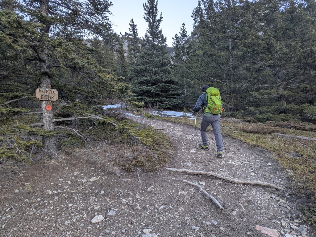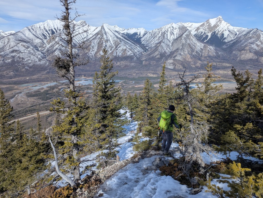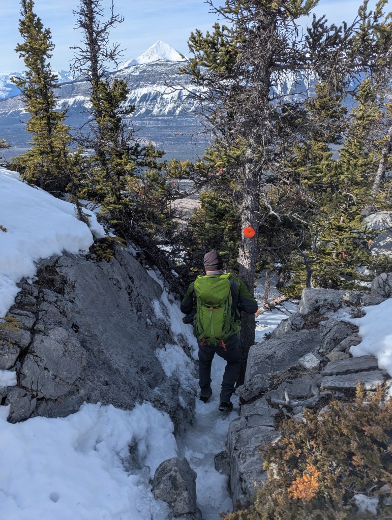 Looking up the rock staircase from the parking lot, a red marker can be seen on a stump to the left and a yellow marker can be seen on a tree to the right. Morro Peak Trail is the one that starts to the left and is marked with red circles throughout. The more obvious trail to the right is Overlander Trail, an official Parks Canada trail with yellow markers, identified as 10b. A connector trail can be picked up a few hundred meters in if one starts out on the wrong trail. It’s easiest to just stick with the red markers from the start though.A few game trails are crossed near the start of the trail, but we were assured to be on the correct trail upon passing this sign about 500 m in.The first section of easy scrambling is encountered about half an hour in. This short, steep section was very icy in winter, making us grateful to have packed sturdy trail crampons rather than just microspikes.The trail emerges from the trees within 45 min and views across the Athabasca River open up to the west. The next hour will consist of fun, easy scrambling following the trail as it picks its way through small cliff bands, generally trending to the southeast.Looking back, gazing north to Chetamon Mountain (left) and Esplanade Mountain (right).Several sections of easy scrambling like this are encountered, keeping the day interesting, but never challenging. In addition to the red markers, supplemental yellow flagging tape is present through this section. We never struggled to figure out which way to go.The trail continues trending to the southeast (right), avoiding the larger cliffs directly ahead. Shortly before the summit, the trail makes a U-turn, ultimately approaching the summit from its south side.After making the U-turn the trail hugs this cliff on the right, guiding us to a handy notch which allows easy access to the summit.The notch in the cliff was well marked and the obvious easiest way up. This part was particularly icy!We reached the top in 2 hrs. The summit cross on Morro Peak gives this small mountain a bit of a European feel. The long ridge seen in the background at the left (southwest) is The Palisade and Pyramid Mountain just peeks out behind it.Summit panorama on Morro Peak.Hawk Mountain stands to the southeast, significantly taller than Morro. The wind at the top encouraged us to keep our stay brief!We returned the way we came, down through the icy notch.Continuing back south briefly before the trail makes a U-turn. Hawk Mountain dominates the view ahead.Working our way back through the easy scrambling section of small cliff bands. Across the valley are Chetamon Mountain (left), Esplanade Mountain (center-right), and Gargoyle Mountain (right)We made it back to the parking lot in 3 hr 45 min, leaving plenty of time to grab brunch at Jasper’s Wafflato. Hiking in cold weather had worked up a healthy appetite in both of us and we greedily indulged in our delicious treats!