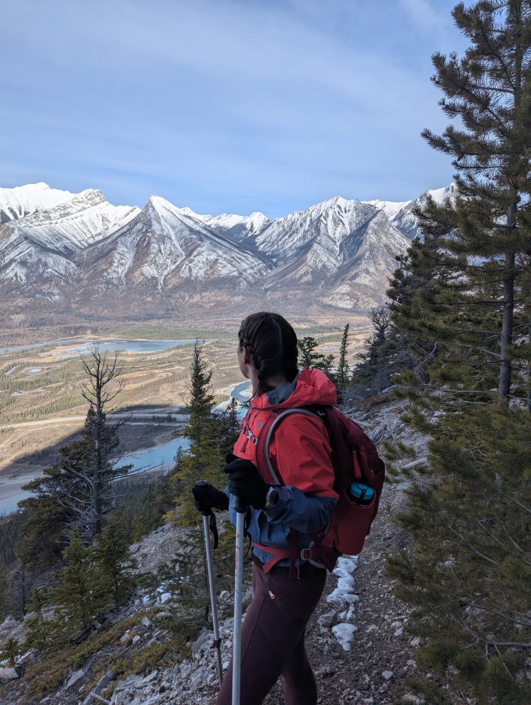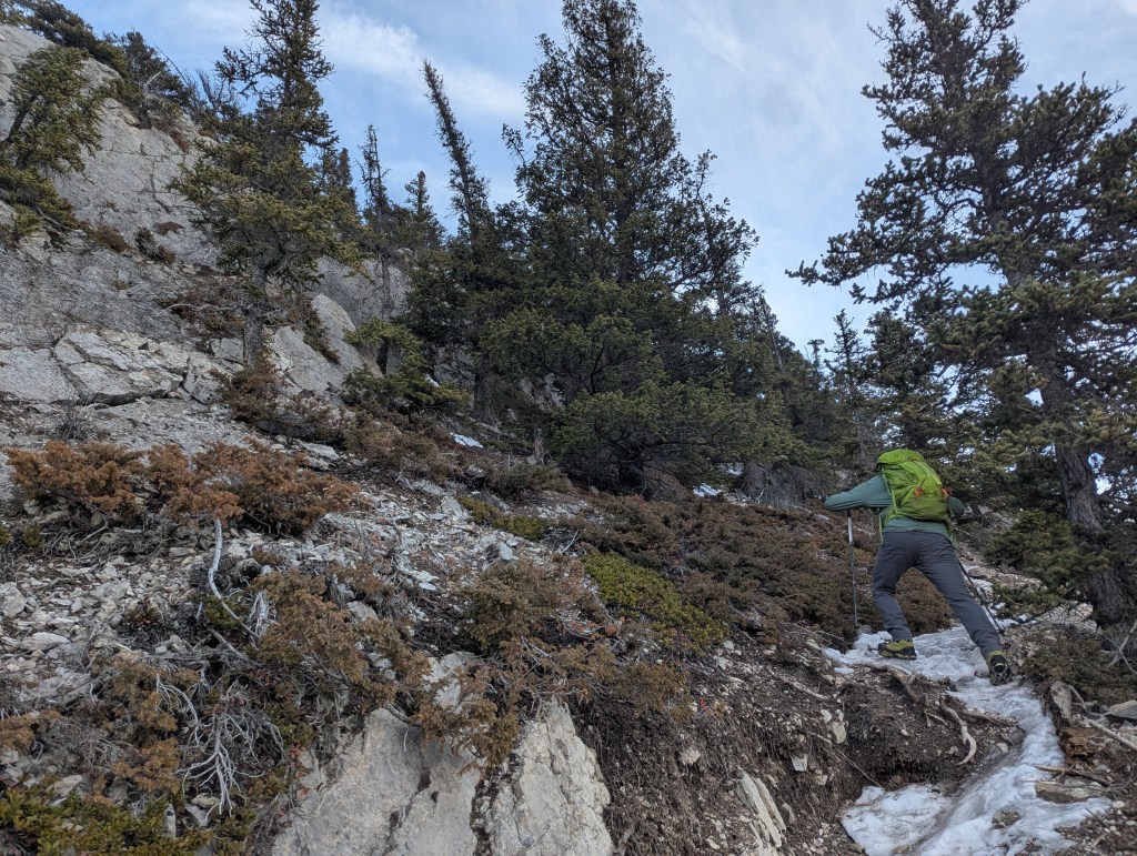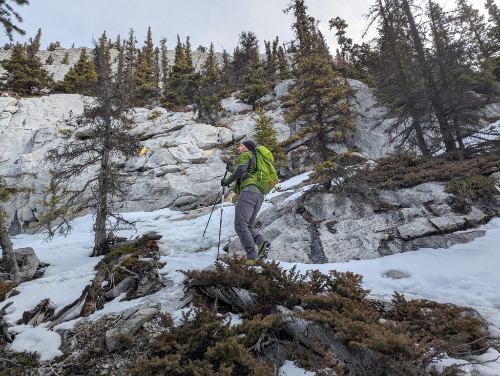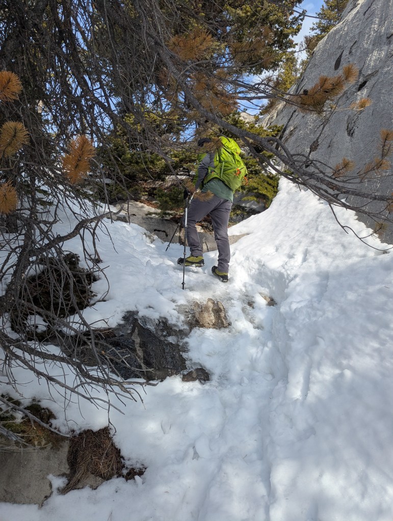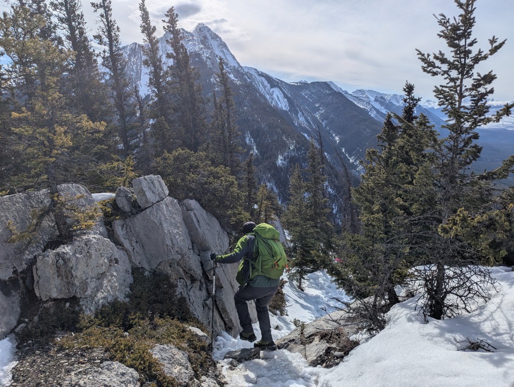Looking up the rock staircase from the parking lot, a red marker can be seen on a stump to the left and a yellow marker can be seen on a tree to the right. Morro Peak Trail is the one that starts to the left and is marked with red circles throughout. The more obvious trail to the right is Overlander Trail, an official Parks Canada trail with yellow markers, identified as 10b. A connector trail can be picked up a few hundred meters in if one starts out on the wrong trail. It’s easiest to just stick with the red markers from the start though.A few game trails are crossed near the start of the trail, but we were assured to be on the correct trail upon passing this sign about 500 m in.The first section of easy scrambling is encountered about half an hour in. This short, steep section was very icy in winter, making us grateful to have packed sturdy trail crampons rather than just microspikes.The trail emerges from the trees within 45 min and views across the Athabasca River open up to the west. The next hour will consist of fun, easy scrambling following the trail as it picks its way through small cliff bands, generally trending to the southeast.Looking back, gazing north to Chetamon Mountain (left) and Esplanade Mountain (right).Several sections of easy scrambling like this are encountered, keeping the day interesting, but never challenging. In addition to the red markers, supplemental yellow flagging tape is present through this section. We never struggled to figure out which way to go.The trail continues trending to the southeast (right), avoiding the larger cliffs directly ahead. Shortly before the summit, the trail makes a U-turn, ultimately approaching the summit from its south side.After making the U-turn the trail hugs this cliff on the right, guiding us to a handy notch which allows easy access to the summit.The notch in the cliff was well marked and the obvious easiest way up. This part was particularly icy!We reached the top in 2 hrs. The summit cross on Morro Peak gives this small mountain a bit of a European feel. The long ridge seen in the background at the left (southwest) is The Palisade and Pyramid Mountain just peeks out behind it.Summit panorama on Morro Peak.Hawk Mountain stands to the southeast, significantly taller than Morro. The wind at the top encouraged us to keep our stay brief!We returned the way we came, down through the icy notch.Continuing back south briefly before the trail makes a U-turn. Hawk Mountain dominates the view ahead.Working our way back through the easy scrambling section of small cliff bands. Across the valley are Chetamon Mountain (left), Esplanade Mountain (center-right), and Gargoyle Mountain (right)We made it back to the parking lot in 3 hr 45 min, leaving plenty of time to grab brunch at Jasper’s Wafflato. Hiking in cold weather had worked up a healthy appetite in both of us and we greedily indulged in our delicious treats!
