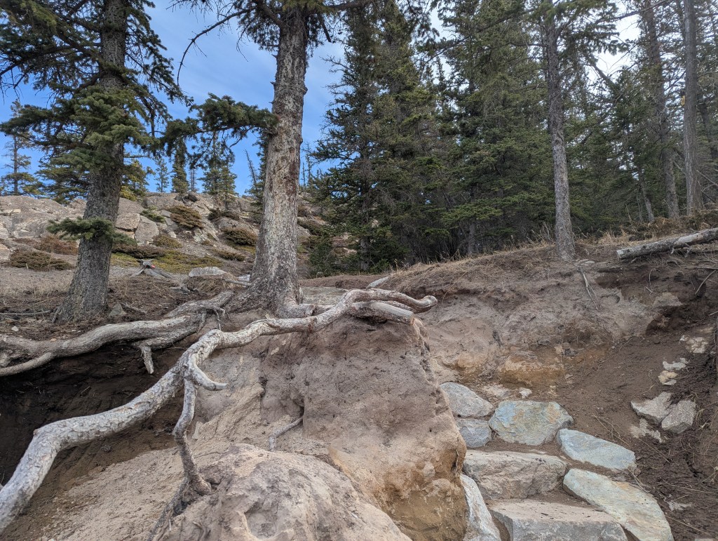 Morro Peak is a small mountain in Jasper which lies at the toe of Hawk Mountain. On a day with great conditions, its lofty neighbour makes for a much more impressive ascent. For the other days though, Morro Peak provides a fun little outing with nice views and more interesting terrain than expected. In summer its southwest face is a popular spot for easier rock climbing, including two bolted multi-pitch climbs. Morro Peak Trail also serves as the climbers’ walk-off route. It and Overlander Trail share the same trailhead, but the two diverge within steps of the parking lot. The parking lot is a paved pull-out along the highway on the east shore of the Athabasca River. Look for an obvious rock staircase.