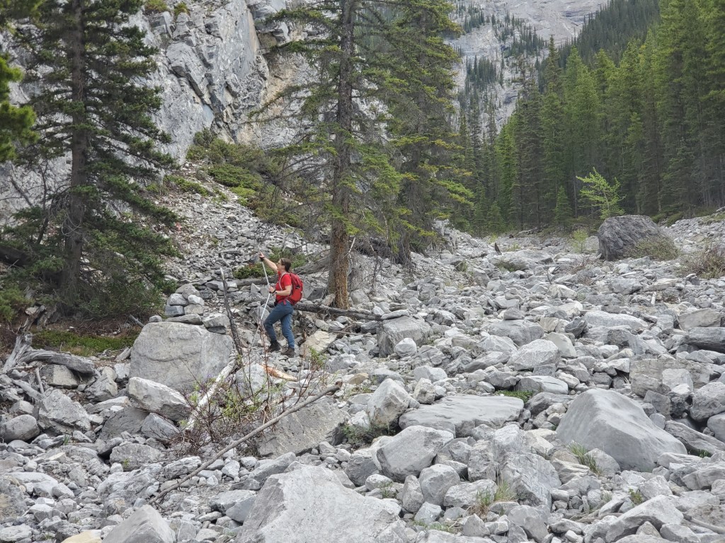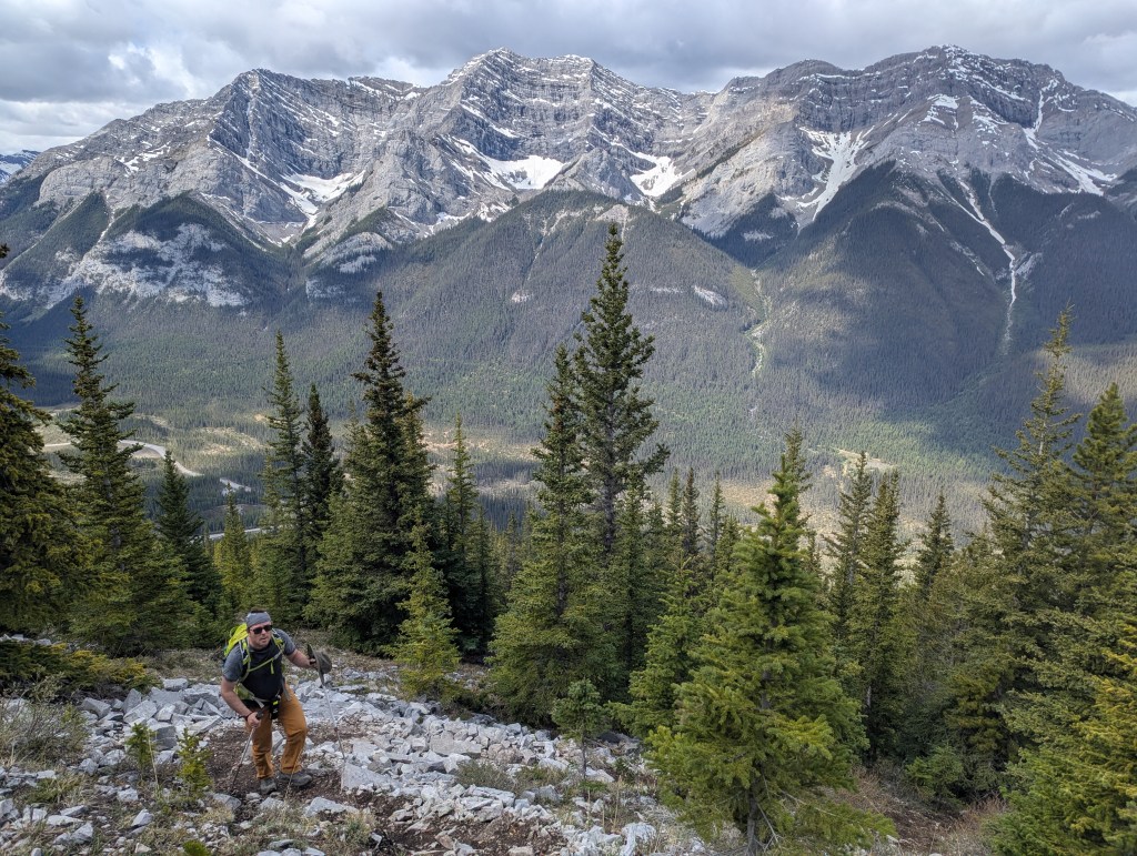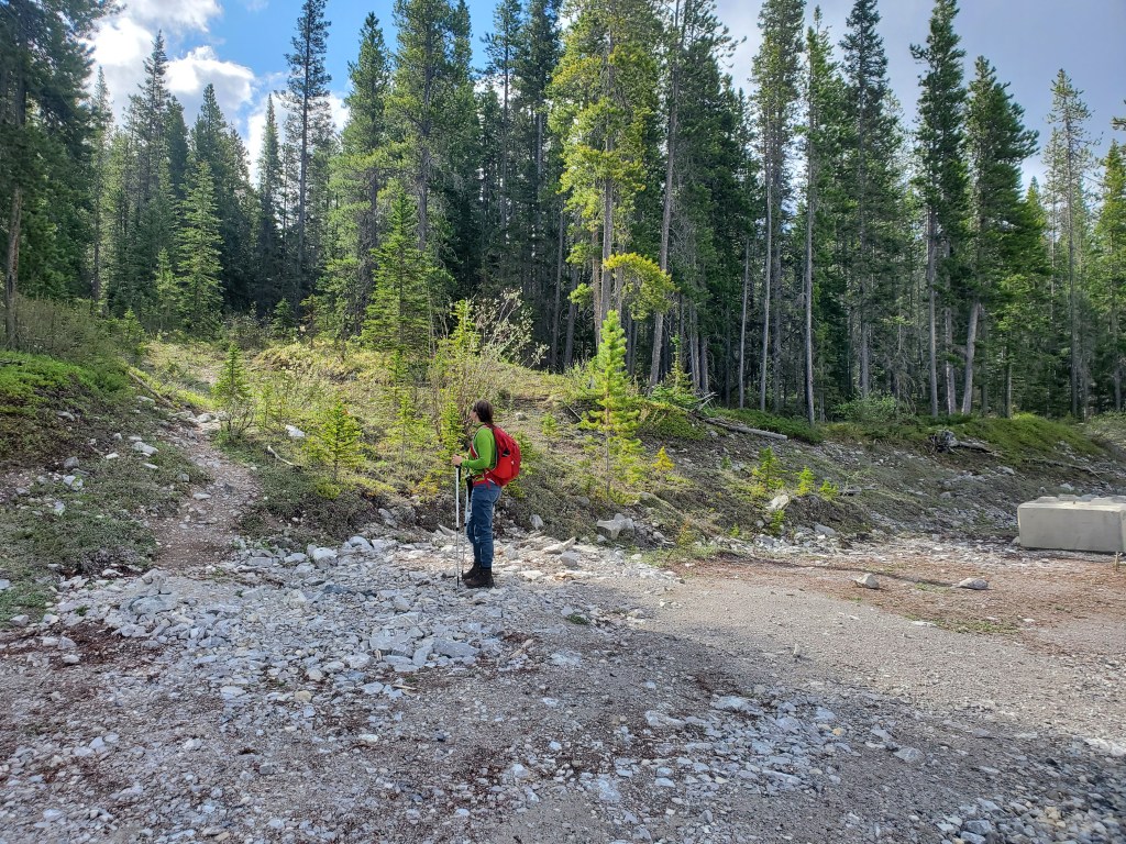 Mount Lawrence Grassi is the highest peak on the Ehagay Nakoda massif, which also boasts the popular objectives of Ship’s Prow, Ha Ling, and Miner’s Peak . It is worth noting that there is no easy scramble route traversing all four peaks, though more technical routes have been reported by others. The turn-off to the trail directly ascending Mount Lawrence Grassi is separated from the highway by a canal, but can be accessed by a walk or bike in from either side – it’s roughly 2.5 km either way. We chose to start from the Goat Creek parking lot, which is the Ha Ling trailhead.