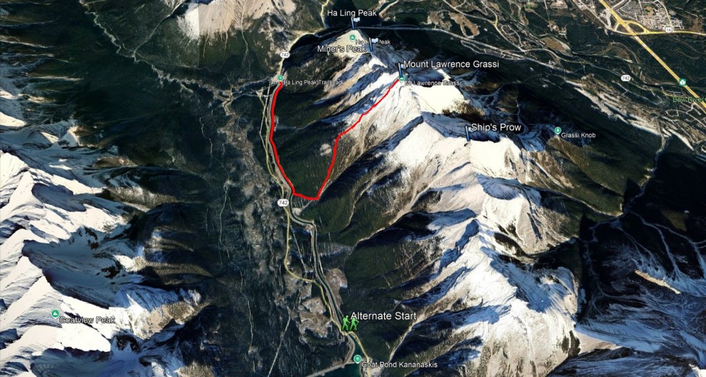 Notes: Kananaskis Conservation Pass Required. Can be accessed from the Ha Ling trailhead or the Ship’s Prow trailhead (identified below as an Alternate Start).