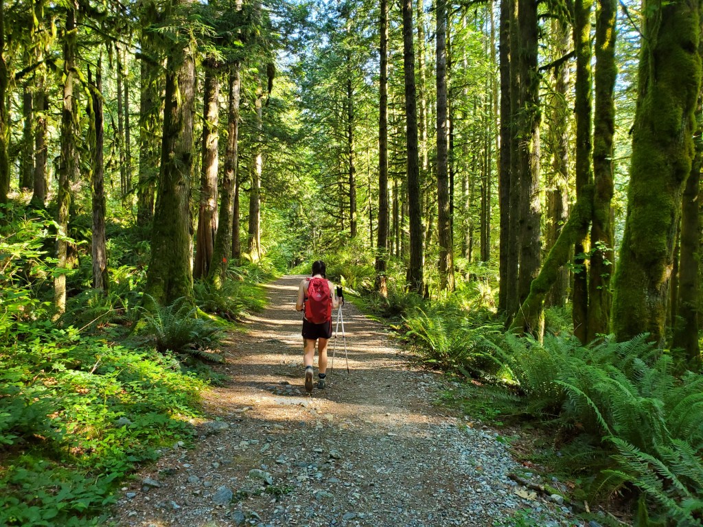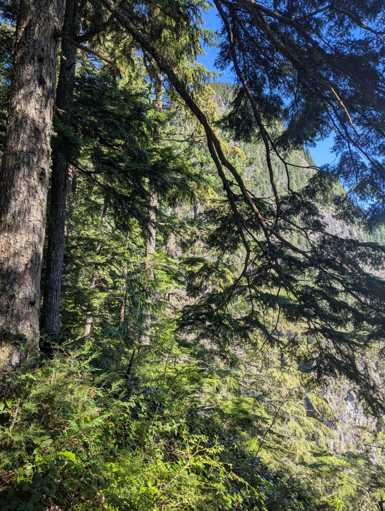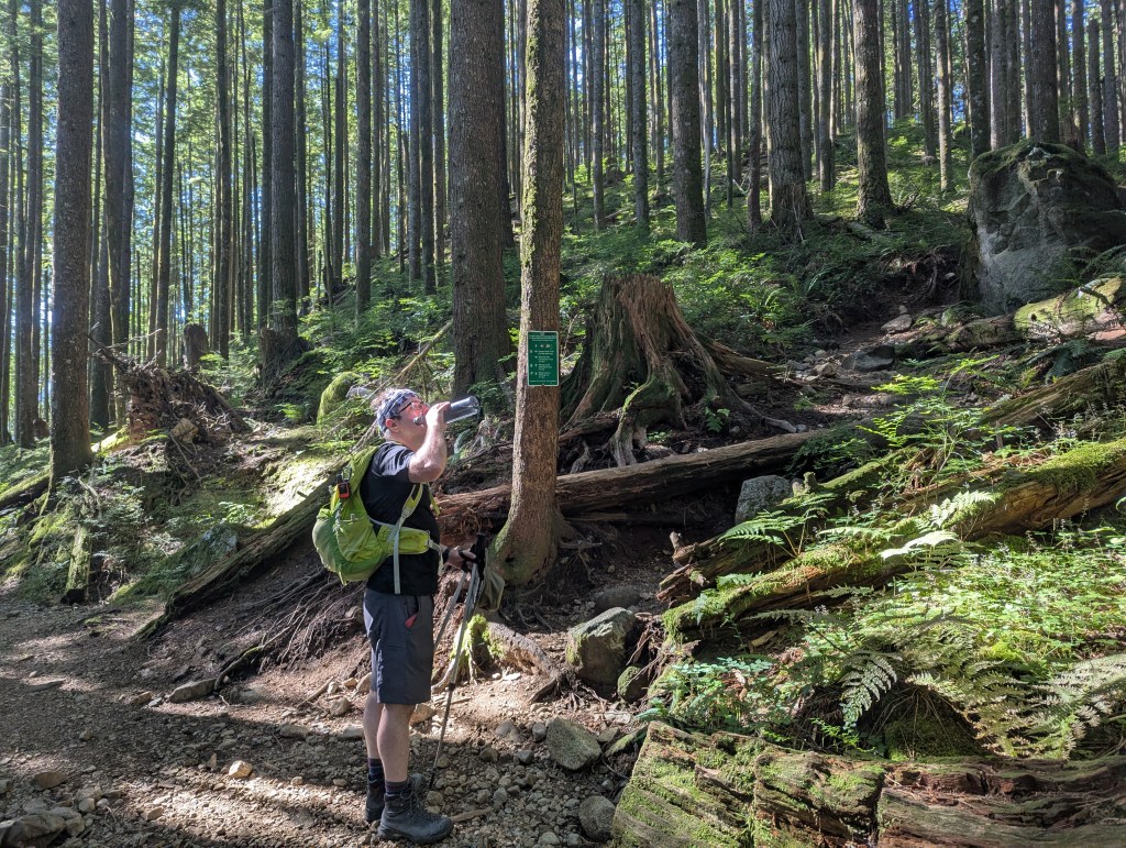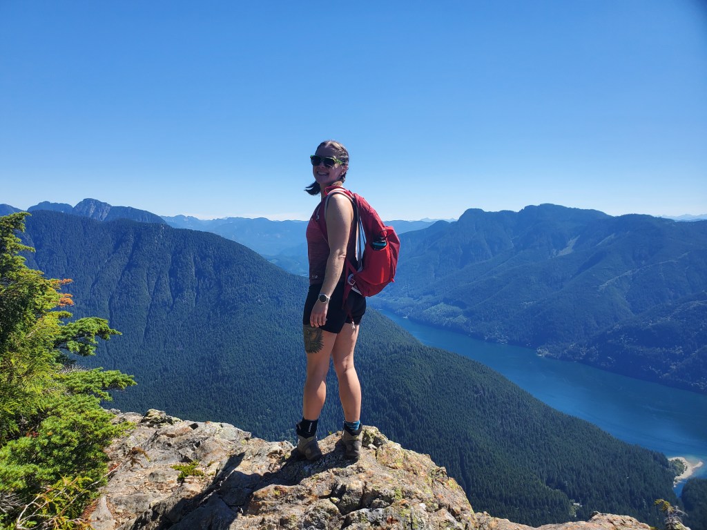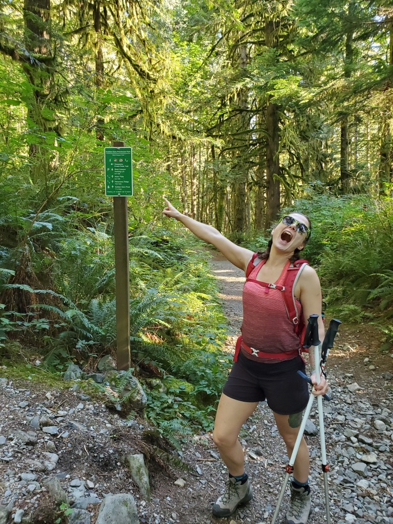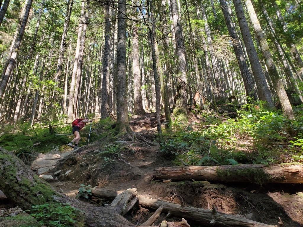 I will never complain about a sunny day in the lower mainland. We only had three days in BC, and ended up catching temperature highs that broke 50-year records, but I was still just grateful it wasn’t raining! Evans Peak has dense tree-cover throughout the route, providing plenty of shade and making it a good choice for a hot day. Even the scrambly section near the top is heavily treed and I expect this peak would be well-sheltered on a windy day too.