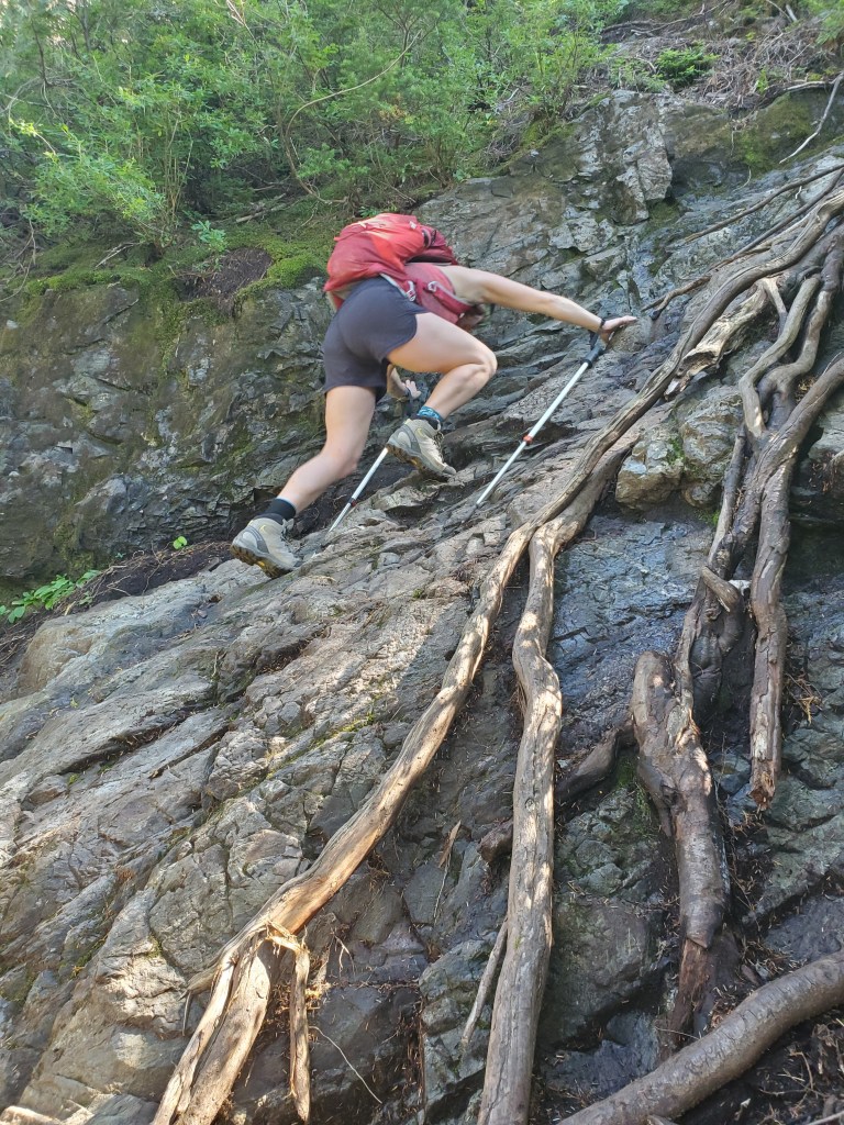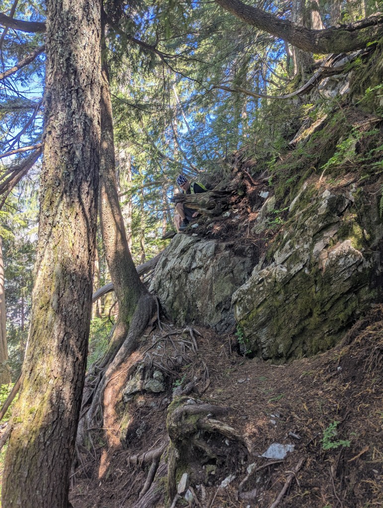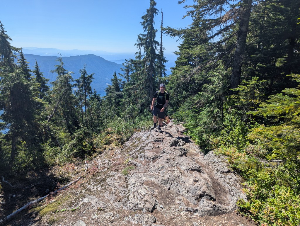 The terrain changes from hiking to easy scrambling for the last 30 min or so before the peak. This photo is the first of three little cliff sections. The second section is directly above this and has a rope that can be used, if wanted, but isn’t needed. It’s worth noting that even on this 35 C day, the rock was a bit damp and slick.