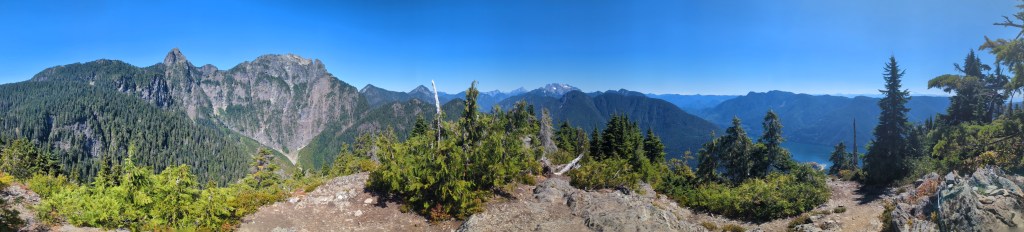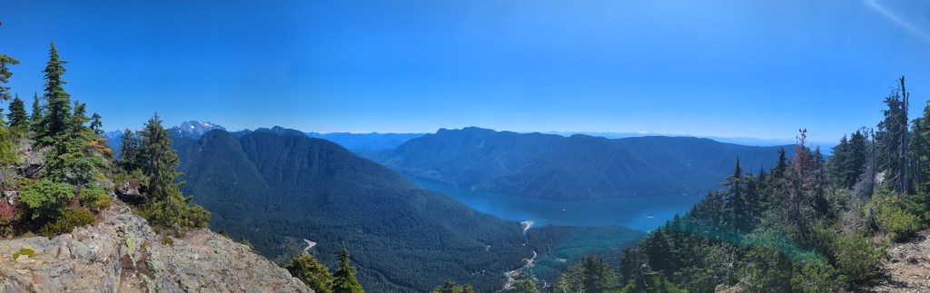 Panorama over Alouette Lake from the viewpoint along the ridge.