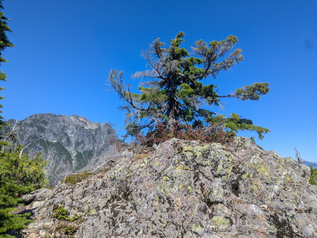 I left Dan at the viewpoint and continued hunting for the peak, described as being “crowned by a small tree”. The trees all look about the same, but I was eventually able to locate the one in question (pictured) by the plaque at its base. I reached the peak in 2 hrs 40 min.