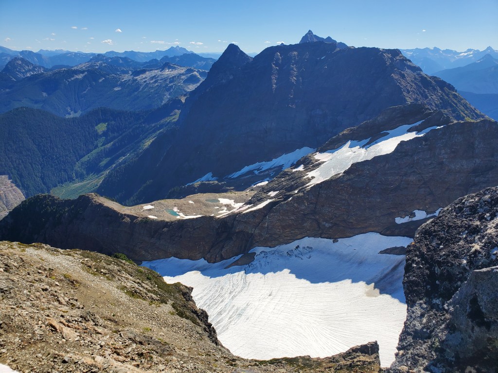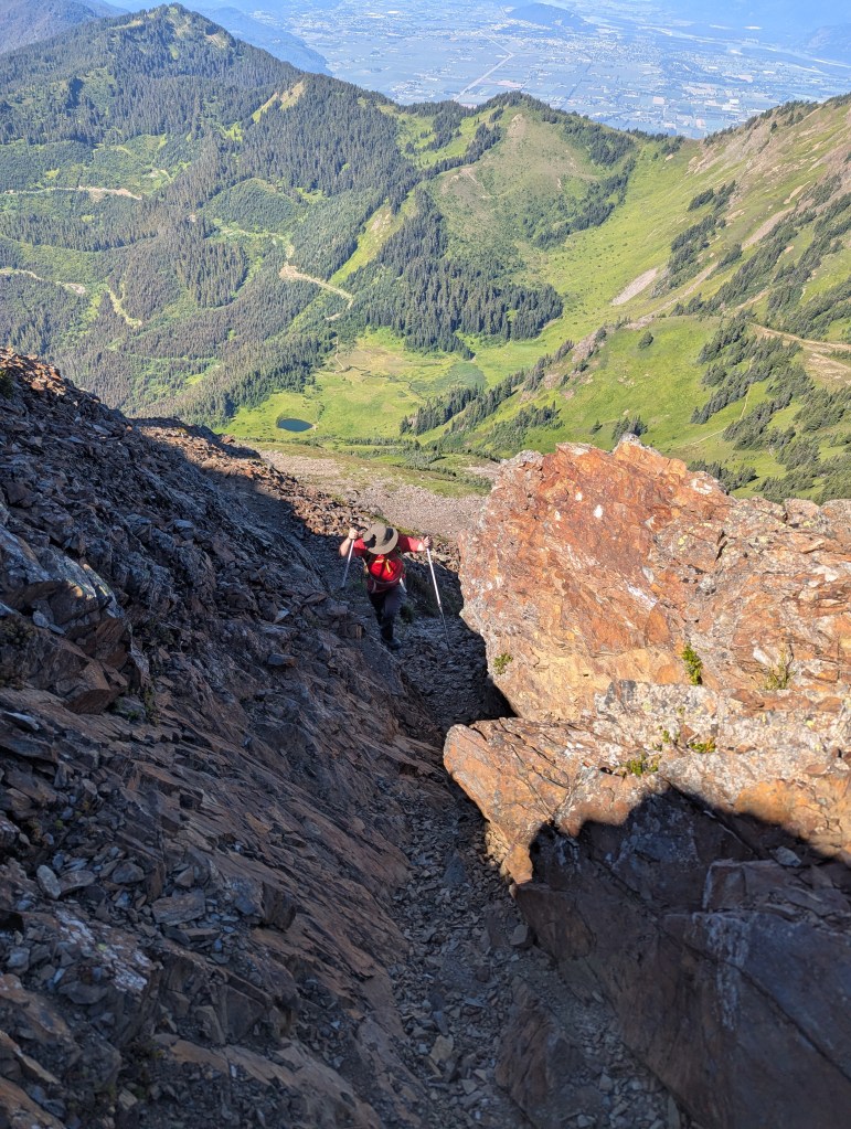 The trail for Lady and Cheam is shared for the first 45 min. It begins as a wide, easy trail with an outhouse about 100 m in from the parking lot. Lady Peak can be seen here to the right and was our first objective. Mount Cheam is out of view to the left.The trail soon winds around a shoulder and enters lush, green meadows. Our route up Lady Peak will take us up the meadowy drainage at center, after skirting around the main bowl.A charming tarn is passed in the meadow.The main trail makes its way up the lower slopes of Lady Peak (ahead) before traversing around to Cheam. We noticed what pleasant morning shade Lady has and chose to start with that one on this scorching hot day. The route up Cheam lies on the southern aspect and was in full sun for the entire day.Once the main trail started its traverse toward Cheam, we kept an eye on the slopes above us to our right and turned upslope when we spotted this easy drainage.Continuing up the slope, we met up with a more obvious trail which traverses between Cheam and Lady higher on the slope. We turned right to follow the trail up Lady, beyond which navigation was straight-forward on a decent trail with regular cairns.Mount Cheam, viewed from the slopes of Lady Peak. The easy, obvious switch-backs leading to the top can be seen from here.The trail up Lady rises toward the cliff band above and then cleverly zig-zags up through weaknesses in the cliffs.Looking down a chute which provides easy passage up through the cliff band. The meadow tarn passed earlier is visible below.Topping out on the cliff band, views open up to the east and north north, including Jones Lake (aka Wahleach Lake) to the right and the Fraser River to the left. Harrison Lake can just be seen in the distance at the upper left.Looking ahead, the summit ridge above looks intimidating from this angle. Our route will keep back from this cliff edge, gaining the summit ridge more to the right.We headed to the right along the cliff band, keeping low and traversing across a nice shelf toward the slopes of the summit ridge. It looks possible to follow the top of the cliff band here instead, but the exposure to the left seemed unnecessary.Rounding the corner of the cliff band and starting up the slope below the summit ridge requires one move of moderate scrambling (pictured). We followed an easy trail up this slope toward the summit ridge above.Once on the summit ridge, a few moves of moderate scrambling lead to the hikers’ summit. I can be seen starting this scrambling section at the left side.This line is foreshortened in photos and not as exposed as it looks. There were plenty of good holds on solid rock, and I only felt that this was moderate scrambling, or YDS class 3 terrain.Topping out at the hikers’ summit. This spot offers good, solid footing and makes for a nice photo or snack break, if you can ignore the amorous insects. This seems to be where most parties turn back, and I won’t begrudge anyone that isn’t comfortable continuing to the exposed peak. Apparently some insects engage in lekking behaviour, a ritual where they gather at the top of mountains to breed. I worry these particular insects may have gotten the wrong impression about our intentions for this summit visit.Panorama from the hikers’ summit on Lady Peak.As we stood at the hikers’ summit, it was impossible not to notice one tall rock, standing on end, the obvious highest point. Okee dokee.We first bypassed around to the other side to get another look. Looking from the south side, there is no question that this tall rock is the peak. I spotted a ramp at the west side (left in this photo) leading to a thin climb up the rock and decided to give it a try.In this photo I am at the top of the ramp and beginning the thin climb. The climb is only about 2.5 m tall and tops out in a low, narrow spot on the rock (About 20 cm wide). From the low spot on the rock, I ever-gracefully smeared my whole body across the top to the highest point. The right side of this photo is very exposed, bumping this up to a difficult scramble (YDS class 4 terrain). The left side has potential to be a bad tumble too.“Well she always knows her place, she’s got style, she’s got grace, she’s a winner. She’s a Lady. whoa whoa whoa, she’s a Lady.” -Tom JonesI reached the top 2 hrs 40 min from the parking lot. Before returning back the way we came, we grabbed a photo looking south to Knight Peak. Judging by the complex, glaciated terrain connecting the two, it becomes obvious why these objectives aren’t typically combined.We returned back down the section of moderate scrambling below the hikers’ summit. This photo better shows how juggy and positive the line is.We made our way back down the slope below the summit ridge and rounded the corner back onto the traverse along the cliff band. Rounding this corner (pictured) is the other brief move of moderate scrambling.We continued down the slopes of Leady Peak on the trail. This time, at the intersection with the upper traverse, we turned right and headed toward Mount Cheam. A very faint trail can be seen ahead of me in this photo.Looking back at Lady Peak from the easy switch-backs of Mount Cheam. We passed two groups descending Cheam, very clearly not for the first time. They were friendly and chatty; one of them confirmed that ridiculous rock on Lady Peak is in fact the true summit.The easy switch-backs lead to a final gentle ramp up to the top of Mount Cheam. Despite the rugged and imposing appearance of this peak, there is absolutely no scrambling required, just chill enjoyable hiking.We reached the top of Cheam 4 hrs 20 min from the parking lot. Jones Lake (aka Wahleach Lake) can be seen in the background.Summit panorama on Mount Cheam.Gazing out over the Fraser Valley. The two mounds in the distance at the left are Sumas Mountain and Chilliwack Mountain. The City of Chilliwack sits in front of Chilliwack Mountain. The town at the right side of the river is Agassiz (Pro