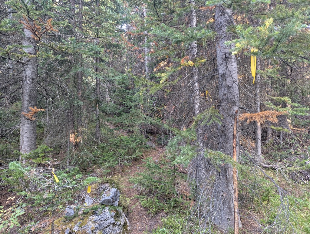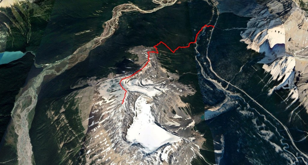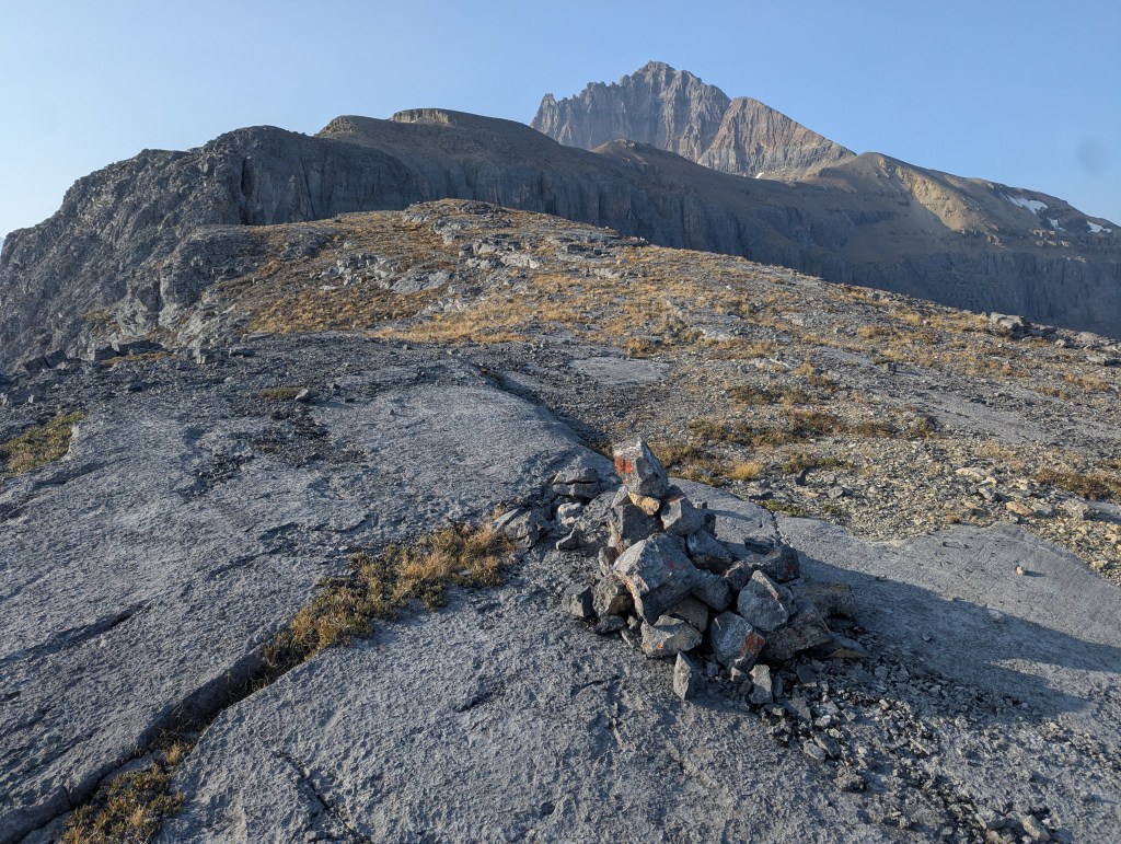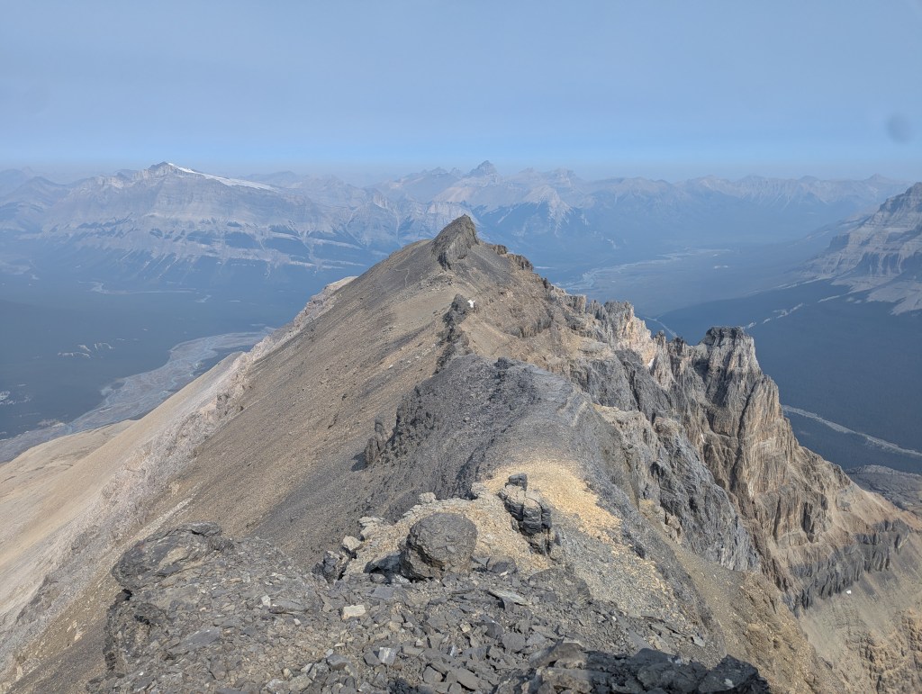 The trail begins at Mistaya Canyon. After crossing the bridge, a sign marks the turn-off for the fire look-out. Mount Sarbach (center) is still looking very far away in this photo.I reached the fire lookout in about an hour and a half, gaining 500 m of elevation on a good trail. The lookout has virtually no views and I continued on, taking the faint trail marked by yellow flagging tape.The faint trail up to the ridge is steeper than the previous one, but is otherwise easy to follow with plenty of cairns. The top section gets rocky with a few scrambly moves.I reached the top of the ridge in 2 hrs 40 min. The grade eases for a while, aside from the two notches described by Kane. The first notch provided no difficulties. The second notch is only 15 min ahead and might be the crux of the day.Looking down the second notch: The far side is easier to gain than it looks from here; the crux is descending the near side. Kane’s third edition of Scrambles suggests a line further left, beyond the edge of this photo. Others have recommended stemming down the chimney at the left below. A small cairn can be seen marking the top of this chimney. The chimney is most easily entered from the left, I learned on the return trip. On the way in I first tried an awkward access at the right, but found the moves a bit too tall and reachy, so I instead just stuck to Kane’s suggested route: I followed cairns around the left side leading down very gentle, albeit very exposed, terrain. Although the line almost feels like easy scrambling while moving through it, the exposure is very real. Both options down are difficult scrambling.Looking back at the second notch. The line I took on the way in wraps around the right side of this mass, as seen in this photo. A little rock mound can be seen about about halfway up marking the line. The chimney I will take on the return trip starts at the left side, over the edge of the cliff, and then winds its way up across the mound, topping out around the center.Past the second notch and continuing on along the broad ridge, the false summit of Mount Sarbach can be seen ahead – The true summit is not far behind it. The ascent line rises along the right-side shoulder, pausing for a bonus notch before continuing its steep ascent.The terrain up the shoulder is mostly stable scree/talus, making travel easier than expected.The views behind are of Glacier Lake and the Howse River.The bonus notch has potential exposure, but a line can be chosen to stay back from the edge.Continuing on, a bit of a rock wall is encountered, but cairns lead to a nice bypass around the right side.Beyond the bypass, the line moves up a broad, loose bowl with some moves of moderate scrambling. This photo is looking down the bowl. The wall which I just bypassed is at the top of the photo. A cairn on the top of the wall indicates that others have simply tackled it head-on, but this is not necessary.Nearing the false summit (left), a good bypass trail is easily picked up leading to the true summit (center). The pinnacles in the col ahead are easily bypassed.Approaching the peak, the terrain eases in appearance and isn’t nearly as steep as it looked from further back.The final exposed line to the peak can be seen from here. The exposed section is the white stripe just below and to the right of the peak. In person, it feels like a bridge leading to a short wall. The bridge is about 0.5 m wide and mostly flat with two solid blocks to climb over. The crux move is reached at the short wall where I moved left onto a thin shelf and then climbed up – this move is airy and extremely exposed. There were certainly loose rocks to avoid, but there were solid hands to be found as well and it didn’t feel sketchy.Looking down at the exposed section below the peak. The bridge can be seen as the white rectangle, with its two blocks. Looking further back along the ridge, my trekking poles can be seen, marking the spot where the exposure increased to the point that I wanted by hands free.Standing at the peak of Mount Sarbach, with (left-to-right) Chephren, Epaulette, and Kaufmann in the background.Gazing southwest with Mount Forbes towering in the distance (left). In front of it stands Mount Outram.Summit panorama.I returned the way I came. In this photo I am standing on the white bridge, holding onto the short wall. I had a solid hand, good feet, and felt secure to grab a photo to better show the exposure here. To my left (top-right of the photo) is a drop of a few hundred meters, to my right (bottom-left of this photo) is a drop of a couple dozen meters. The thin airy ledge I used is easily seen at the right side of this photo.Continuing back down, this photo better shows the terrain below the peak , once the exposed section is passed. It is much tamer than it had appeared on the approach.Returning back down the bonus notch. Noticing a trend, this terrain was gentler than it looked from the other side.On the return trip, I climbed up the chimney at the second notch. The exposure in the chimney is mostly only at the entrance and exit. The chimney itself is quite deep and secure feeling; I kept right at a Y. In this photo I am standing near the bottom of the chimney, below me it exits out over a drop of a couple dozen meters. A side step is required to avoid the drop.Looking back down the chimney after topping out.Looking back at the ridge once back below it, the first notch is obvious at center. I did not check whether one could sidehill directly over to it from here, nor did I get a look at whether a sidehill route exists to the second notch. If you have tried, feel free to comment below for others!
