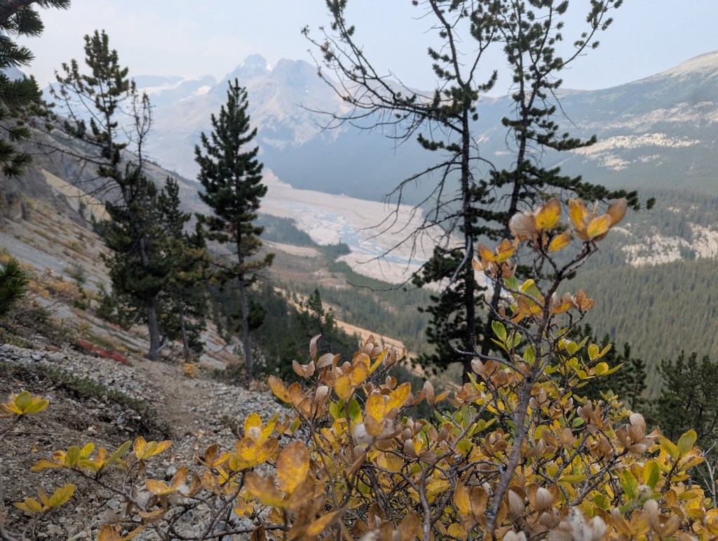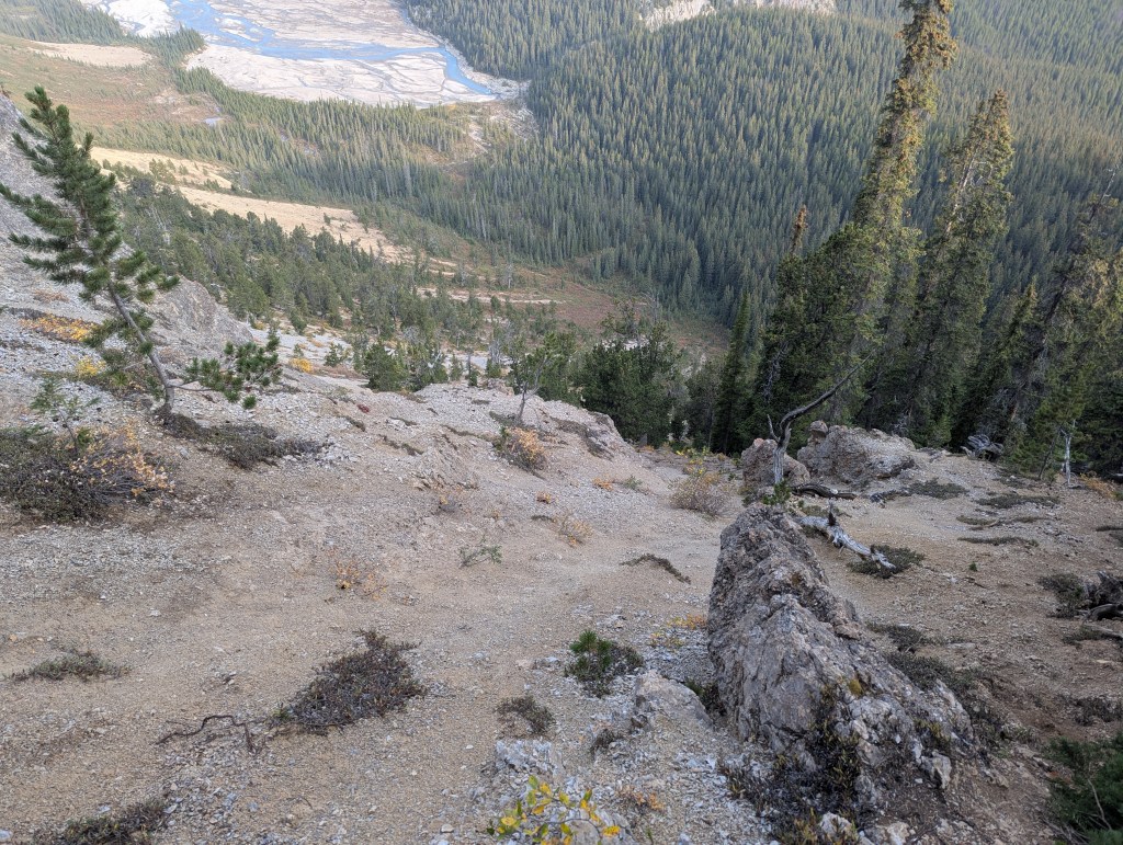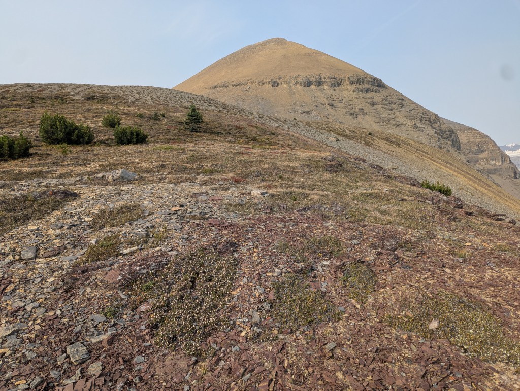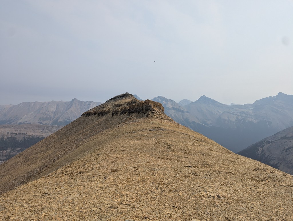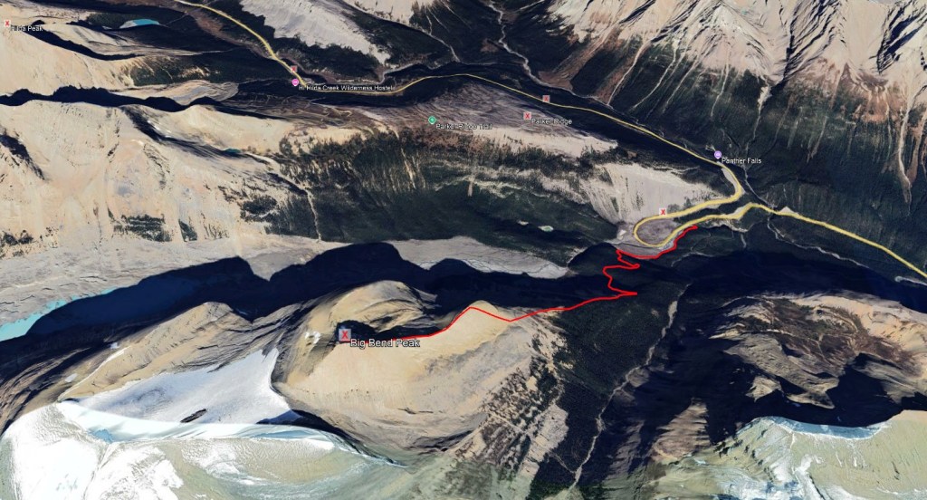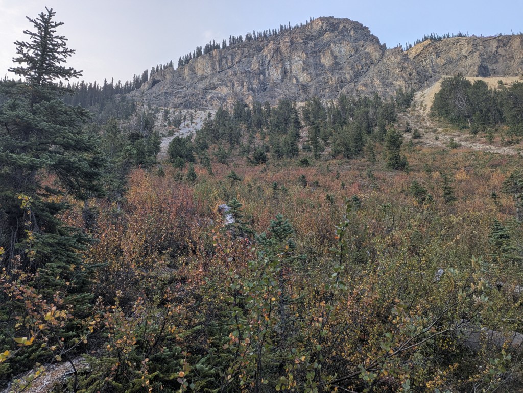 The driveway is nearly invisible until you are right above it, but it was ok for a car to access as of 2025. It’s probably still worth pausing to get a look before committing, plus the parking only accommodates about four vehicles. If full or inaccessible, there is parking less than a kilometer to the north, at the middle of the big bend in the highway.The route starts by crossing the old highway bridge, from before the highway was realigned. A trail can be found in the trees to the right, a few meters past the bridge. The trail meets up with an overgrown road in half a kilometer.Once on the overgrown road, the way is obvious. The road turns left into the trees and then rises in broad switch backs up a treed slope.Shortly after the trail begins to lose elevation, a clearing opens up to the left, about 2.5 km from the trailhead. A faint trail has formed to the left side of the clearing, improving travel a bit, but it still took me 30 min to reach the cliff band above.I followed the faint trail up a direct line to the left edge of the cliff band. Looking down, this line is doable, but steep and loose for the last couple of meters. There is also a trail that ducks left into the trees just before the steepest part. It’s not as direct, but the terrain is a little easier.Once above the cliff, light braiding trails lead through the forest, mostly following the cliff edge. Where the trails disappear, the direction of travel is generally obvious and I tended to find myself back on a trail within a few minutes. The false summit of Big Bend can be seen ahead.After breaking out of the trees and gaining a short scree slope, the false summit of Big Bend comes into view ahead. The slope ahead is tedious, terrible quality scree. It’s the kind of scree that makes me feel like I can’t pause for a break because I will immediately start sliding down, which becomes especially tiring on a smoky day when it is hard to breathe. I avoided the cliff band seen half way up the false summit, and skirted around its left side.This is essentially the view for an hour.Once the top of the tedious scree slope is reached, the true summit of Big Bend Peak comes into view. From here the peak is a little under an hour away on easy terrain. The North Towers of Mount Saskatchewan can be seen in the background at center.Looking back at the false summit, small cliff bands encountered along the way provide no difficulty and can be bypassed to climber’s left (the right side of this photo looking back).The small cliff bands also provide a handy place to balance a camera! This is typical terrain near the peak.I reached the peak in roughly 4 hrs 15 min. To the left is the North Towers of Mount Saskatchewan and to the right are Mount Jimmy Simpson Junior and Jimmy Simpson Junior II. The terrain between Big Bend and these peaks is glaciated and the connecting route would not be a scramble (Instead, these are typically access by coming up the valley to the left, see my trip report). The peak directly in front of me is called “Mount Totally Awesome View” by some, or Mount Saskatchewan W4.5 officially. Mount Saskatchewan is out of view to the left.Summit panorama from Big Bend Peak – Certainly worth battling tedious scree for!Pausing for a quick selfie with The Flash in front of Mount Andromeda.Looking back toward the highway, the big bend can be seen at center. Standing above it to the left is Parker Ridge, which looks quite a bit more impressive from this side than the highway side. I returned the way I came, along the false summit (right).The tedious scree slope was significantly easier on the descent and I soon found myself back in the trees, on the braiding, sometimes-present trail. The trail is minimal here, but the way forward is obvious.Once through the trees and below the cliff band, I made my way back down the slope to the overgrown road below. Travel down this slope was also much easier on the descent, and the afternoon sun made a lovely show of the early-autumn colours.I made it back to the car in 7 hours. The parking area is along the edge of a deep, winding canyon. Not pictured: The wonderful booming roar of rushing water. Also not pictured: Me dragging myself on my belly to get close to the edge. The road can be seen above to the right.
