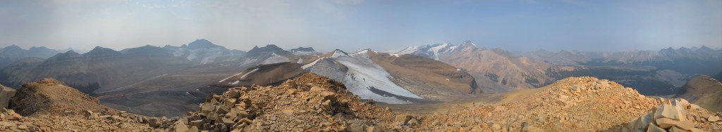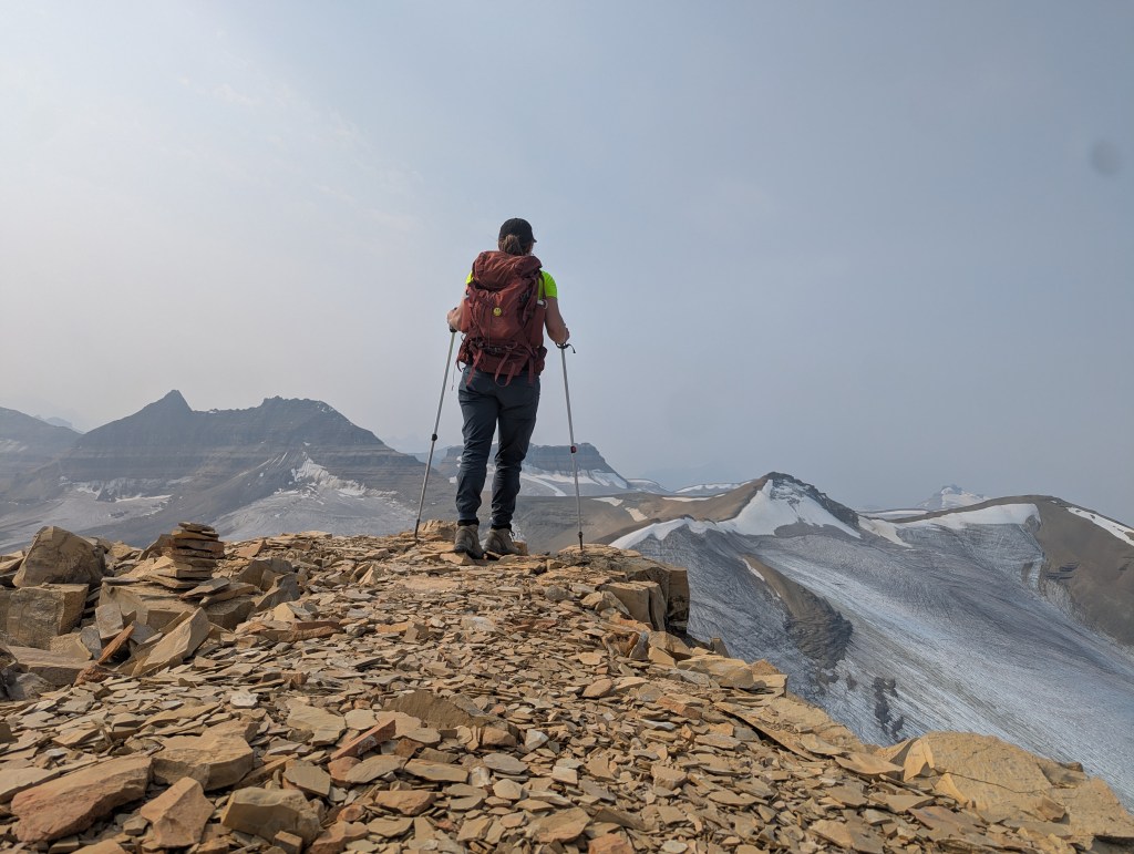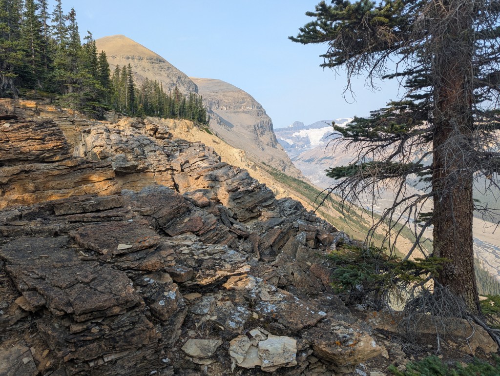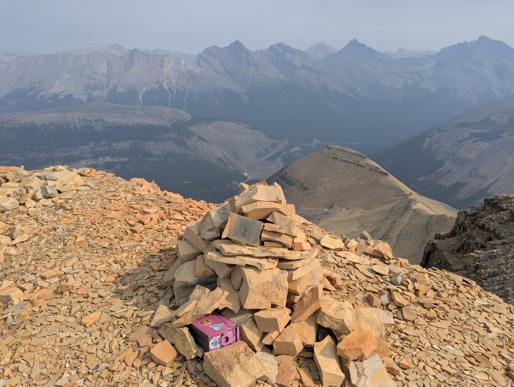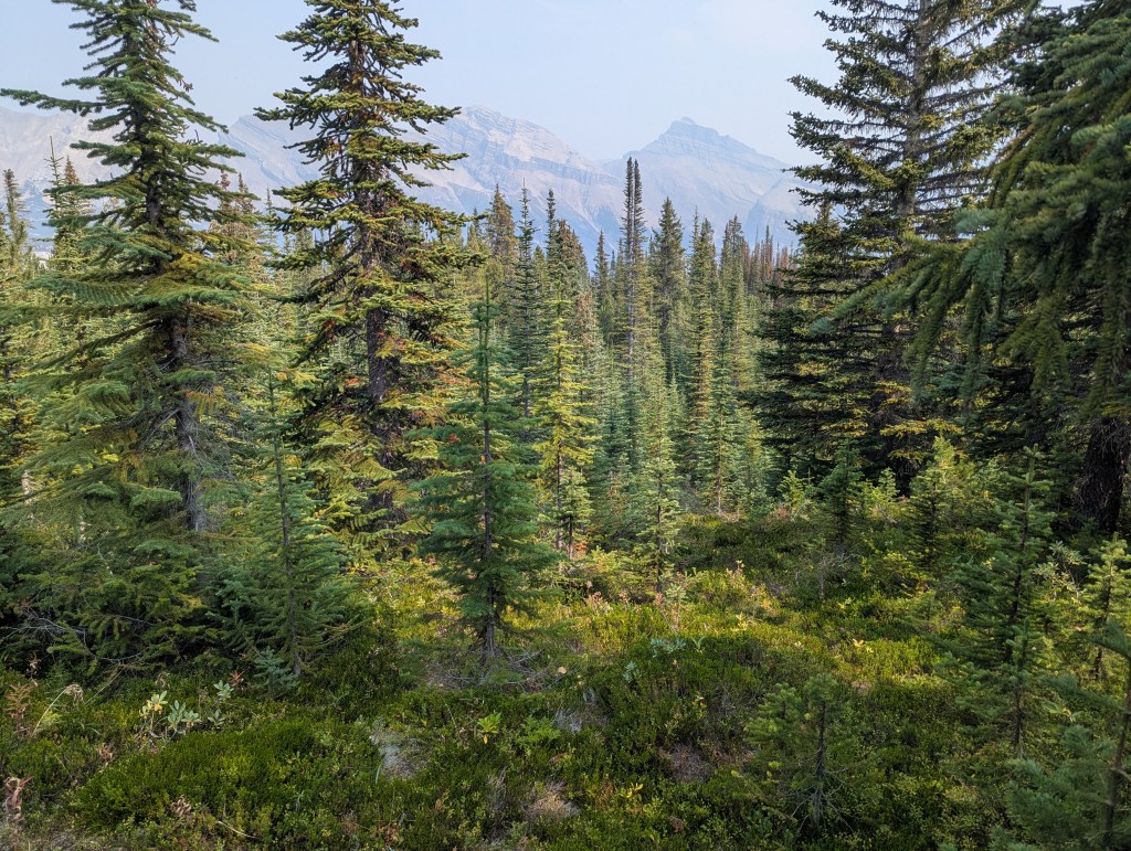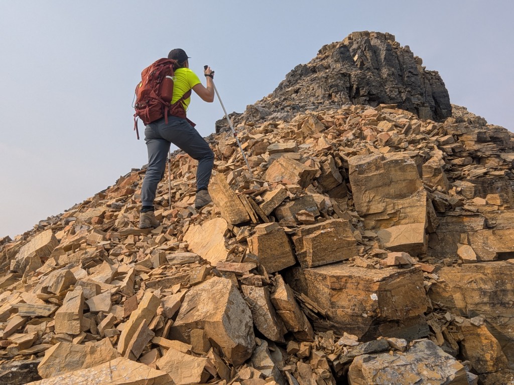 The driveway is nearly invisible until you are right above it, but it was ok for a car to access as of 2025. It’s probably still worth pausing to get a look before committing, plus the parking only accommodates about four vehicles. If full or inaccessible, there is parking less than a kilometer to the north, at the middle of the big bend in the highway.The route starts by crossing the old highway bridge, from before the highway was realigned. A trail can be found in the trees to the right, a few meters past the bridge. The trail meets up with an overgrown road in half a kilometer.Once on the overgrown road, the way is obvious. The road turns left into the trees and then rises in broad switch backs up a treed slope.Shortly after the trail begins to lose elevation, a clearing opens up to the left, about 2.5 km from the trailhead. A faint trail has formed to the left side of the clearing, improving travel a bit, but it still took me 30 min to reach the cliff band above.I followed the faint trail up a direct line to the left edge of the cliff band. Looking down, this line is doable, but steep and loose for the last couple of meters. There is also a trail that ducks left into the trees just before the steepest part. It’s not as direct, but the terrain is a little easier.Once above the cliff, light braiding trails lead through the forest, mostly following the cliff edge. Where the trails disappear, the direction of travel is generally obvious and I tended to find myself back on a trail within a few minutes. The false summit of Big Bend can be seen ahead.After breaking out of the trees and gaining a short scree slope, the false summit of Big Bend comes into view ahead. The slope ahead is tedious, terrible quality scree. It’s the kind of scree that makes me feel like I can’t pause for a break because I will immediately start sliding down, which becomes especially tiring on a smoky day when it is hard to breathe. I avoided the cliff band seen half way up the false summit, and skirted around its left side.This is essentially the view for an hour.Once the top of the tedious scree slope is reached, the true summit of Big Bend Peak comes into view. From here the peak is a little under an hour away on easy terrain. The North Towers of Mount Saskatchewan can be seen in the background at center.Looking back at the false summit, small cliff bands encountered along the way provide no difficulty and can be bypassed to climber’s left (the right side of this photo looking back).The small cliff bands also provide a handy place to balance a camera! This is typical terrain near the peak.I reached the peak in roughly 4 hrs 15 min. To the left is the North Towers of Mount Saskatchewan and to the right are Mount Jimmy Simpson Junior and Jimmy Simpson Junior II. The terrain between Big Bend and these peaks is glaciated and the connecting route would not be a scramble (Instead, these are typically access by coming up the valley to the left, see my trip report). The peak directly in front of me is called “Mount Totally Awesome View” by some, or Mount Saskatchewan W4.5 officially. Mount Saskatchewan is out of view to the left.Summit panorama from Big Bend Peak – Certainly worth battling tedious scree for!Pausing for a quick selfie with The Flash in front of Mount Andromeda.Looking back toward the highway, the big bend can be seen at center. Standing above it to the left is Parker Ridge, which looks quite a bit more impressive from this side than the highway side. I returned the way I came, along the false summit (right).The tedious scree slope was significantly easier on the descent and I soon found myself back in the trees, on the braiding, sometimes-present trail. The trail is minimal here, but the way forward is obvious.Once through the trees and below the cliff band, I made my way back down the slope to the overgrown road below. Travel down this slope was also much easier on the descent, and the afternoon sun made a lovely show of the early-autumn colours.I made it back to the car in 7 hours. The parking area is along the edge of a deep, winding canyon. Not pictured: The wonderful booming roar of rushing water. Also not pictured: Me dragging myself on my belly to get close to the edge. The road can be seen above to the right.