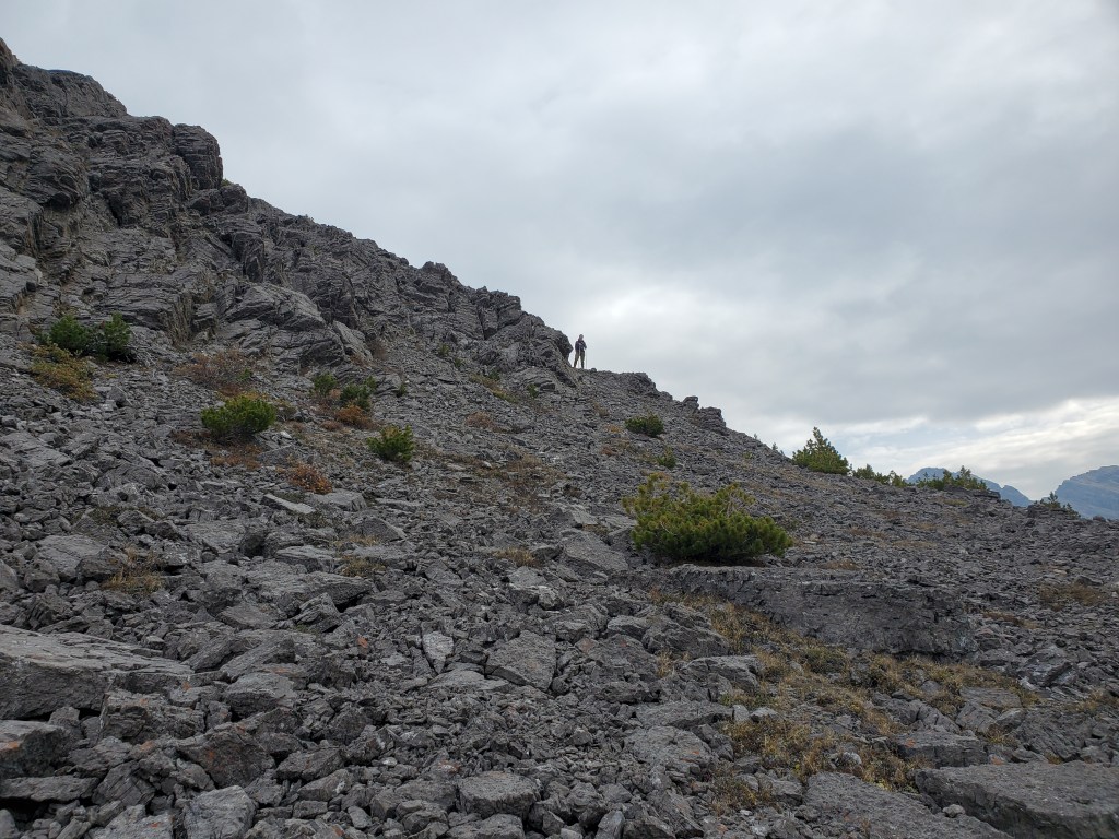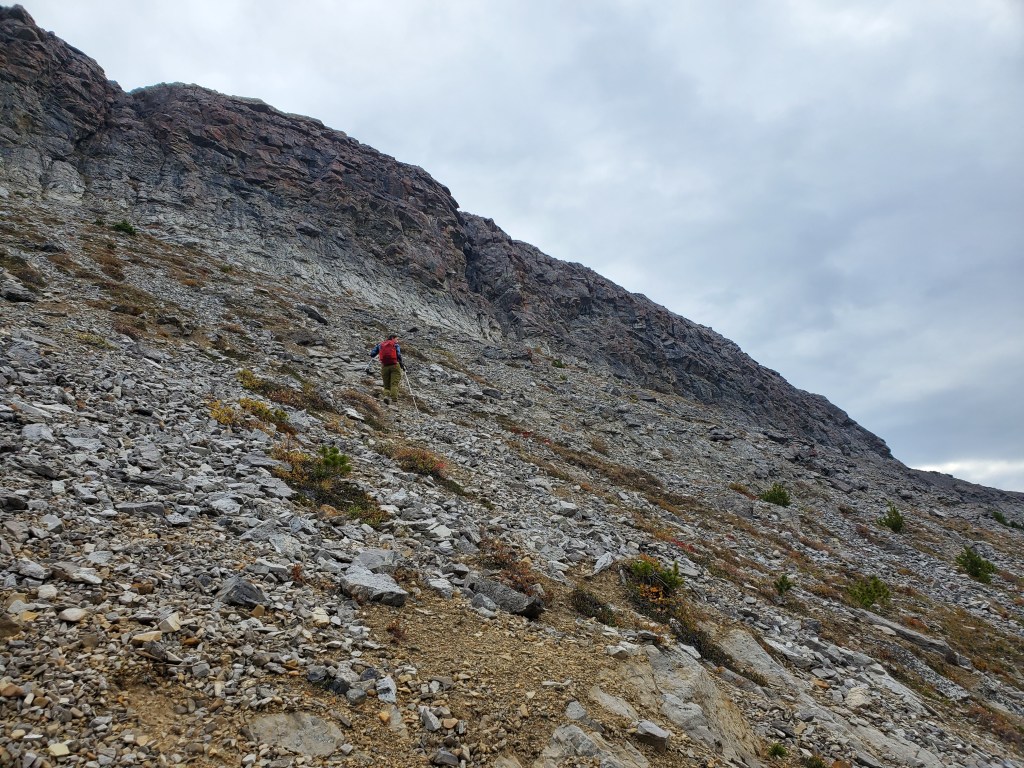A wide, obvious trail leaves the parking lot and crosses a small meadow before switch-backs begin rising up the slope ahead. The views of surrounding peaks open up as the trail makes its way up the slope. To the north lies Mount Athabasca (left) and Hilda Peak (center-left).Within half an hour, the switch-backs end and the trail flattens. At the Y ahead, the right branch leads to a viewpoint on a lower summit, and the branch straight ahead wraps around below the peak, leading to a different viewpoint. The most direct path to the peak would be to leave the trail roughly here and head left, but we continued following the trail straight. We will loop back by that line later.This rocky outcropping overlooking the Saskatchewan Glacier is passed just before the end of the official trail. To the left are Mount Saskatchewan Junior I and II. Big Bend Peak is just out of view further left.Beyond the end of the trail, we continued along easy scrambling terrain, traversing below the cliff above until a ramp opened up to the right.An easy gravel ramp opened up at the right side of the cliff, providing access to the broad summit above.Looking back as we make our way across the broad summit plateau. GPS mapping labels the peak as being in the lower area off to the left, so we continued hunting for the highest point.After a bit of meandering and standing on large rocks, we picked the spot where no neighbouring rock appeared higher from our vantage point. Content with our meandering of the summit plateau, we looped back to the trails ahead. The main trail back to the parking lot descends down to the right, but we’ll add a detour to the viewpoint on the lower summit by continuing straight ahead first.This viewpoint is a fine place to admire Mount Athabasca (center) and Hilda Peak (right); the detour only adds 20 minutes to the hike.