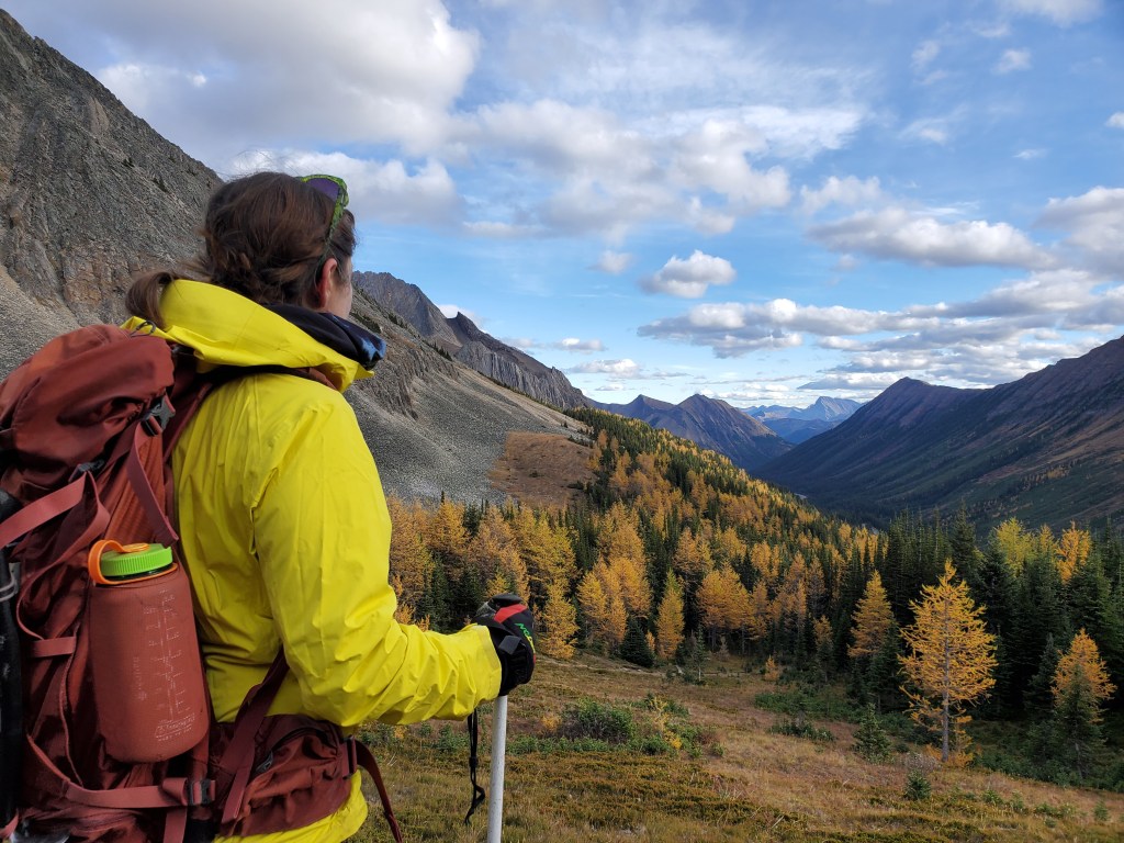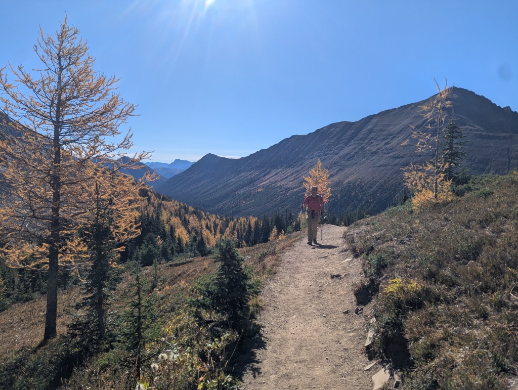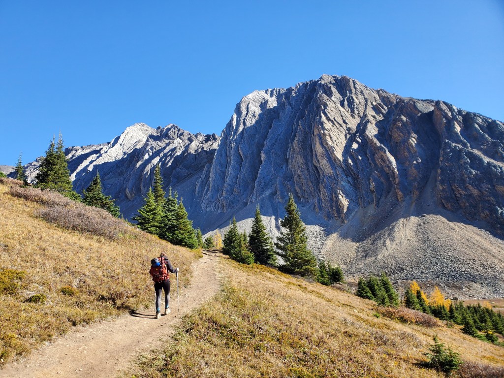 While the “larch madness” crowds can sometimes get a bit overwhelming, the sublime golden larches somehow just keep drawing me back every autumn. The approach to Mount Rae passes through Ptarmigan Cirque, an extremely popular larch hike, which I just couldn’t resist! As expected, the parking lots were completely packed and it took a bit of patience to find a spot. The main trail was bustling with people, but we left the crowds and the larches behind within half an hour.