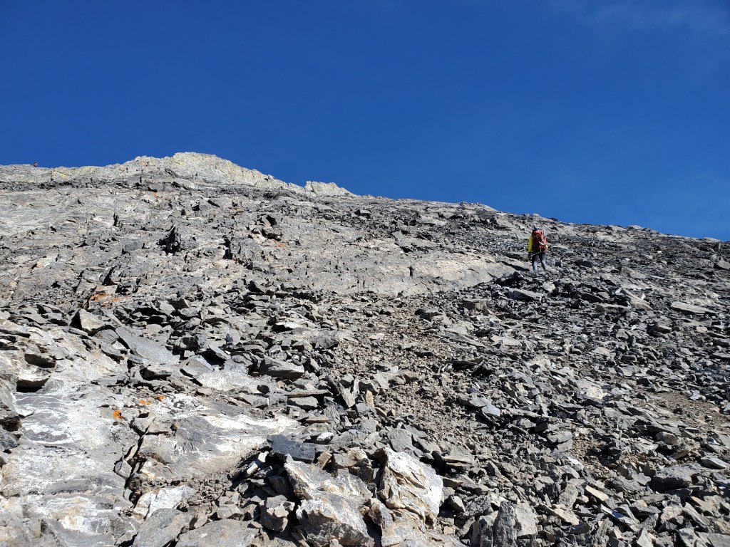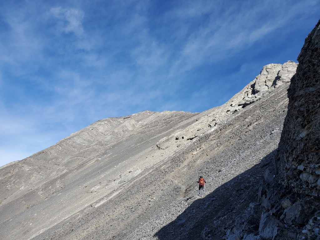 Kane rates this objective as a moderate scramble, but also notes that the summit ridge can be bypassed to the left. The terrain to the left of the summit ridge looked steep, slabby, and in my opinion sketchier than the summit ridge. I believe it’s possible that parts of the slope have washed away, taking the old bypass trail with them. The route following the summit ridge required a couple of exposed moves, making me bump this rating up to a difficult scramble.